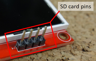 1) Solder header pins for the SD card. There are four pins opposite to the display pins, as shown in figure below.