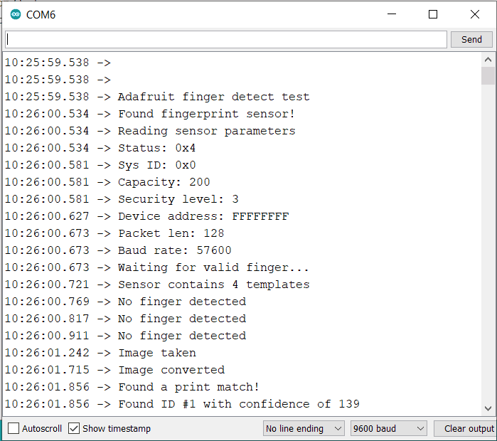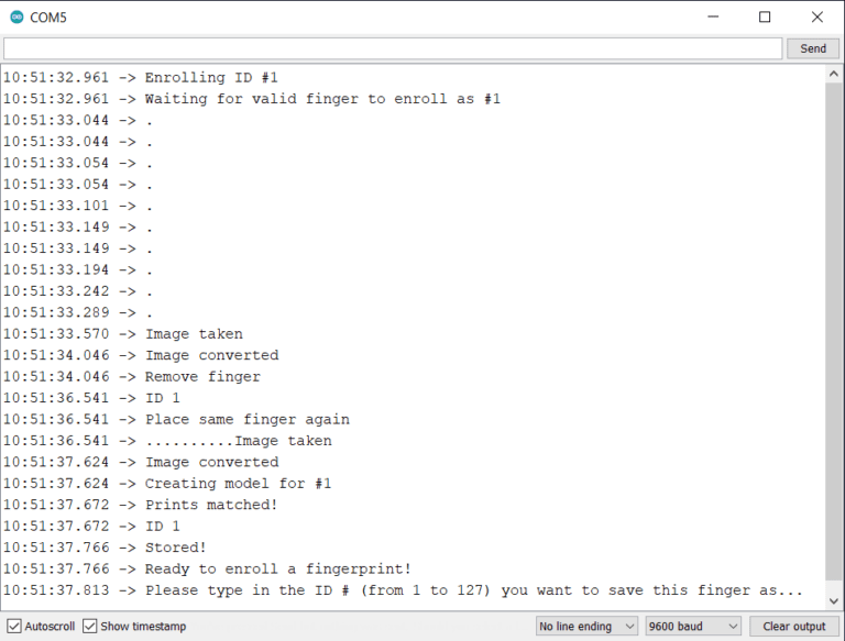 Now enter the ID number in the Serial Monitor Screen and send it. You can then follow the screen instruction to enroll your fingerprint.