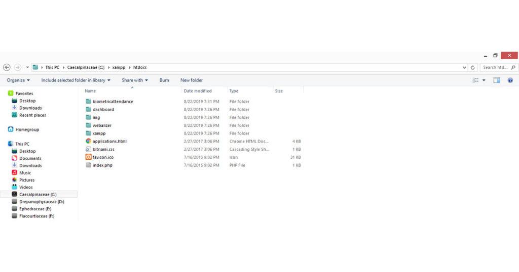 Once the download and installation is completed copy the following folder:Biometricattendance Folder to C:\xampp\htdocs. This is the location of the website in your C drive.