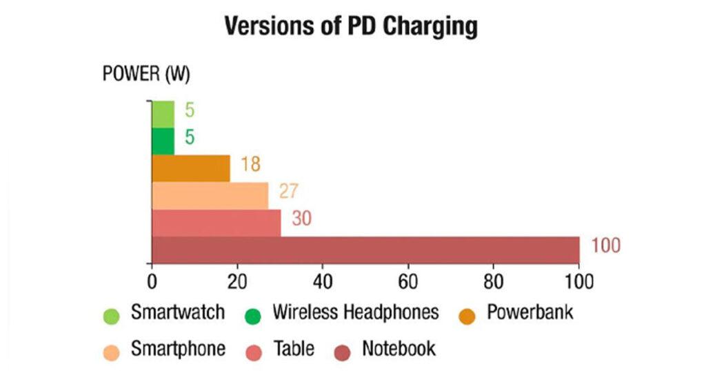 - PD supports power output up to 100W, which makes it suitable for larger devices like laptops and even some monitors, in addition to phones.