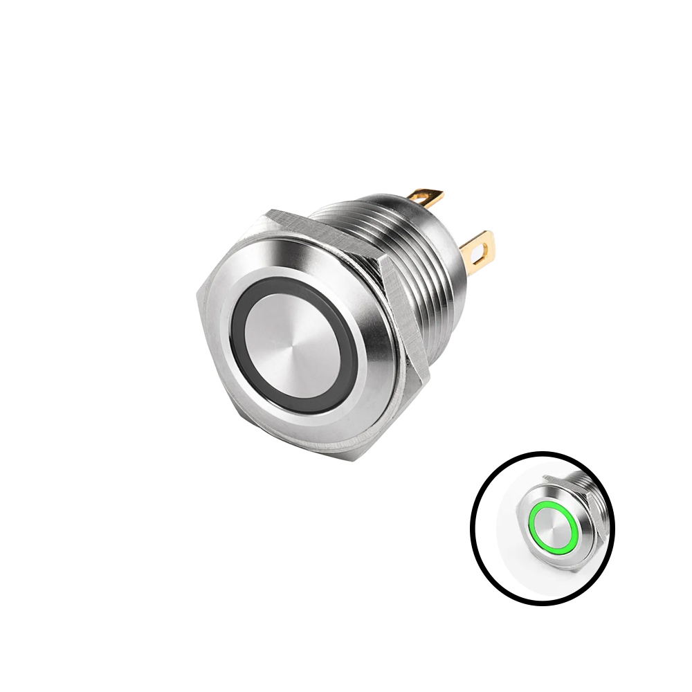 Short Flat Head 16MM 12-24V Ring Non-Latching Green Metal Push Button Switch with Led Light Waterproof