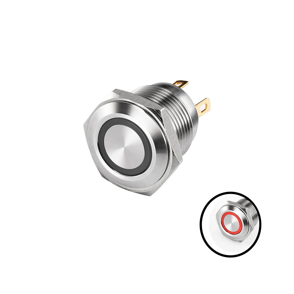 Short Flat Head 16MM 12-24V Ring Non-Latching Red Metal Push Button Switch with Led Light Waterproof