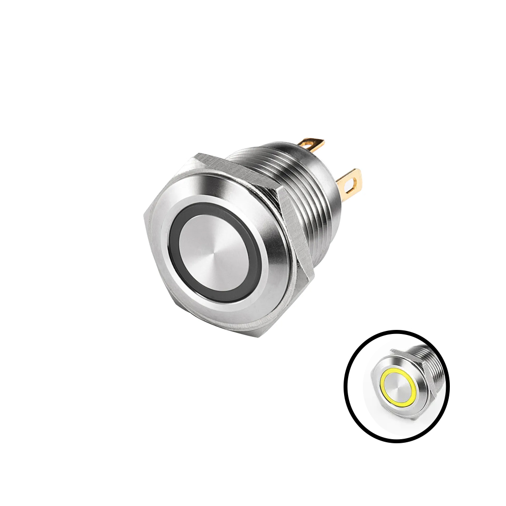 Short Flat Head 16MM 12-24V Ring Non-Latching Yellow Metal Push Button Switch with Led Light Waterproof