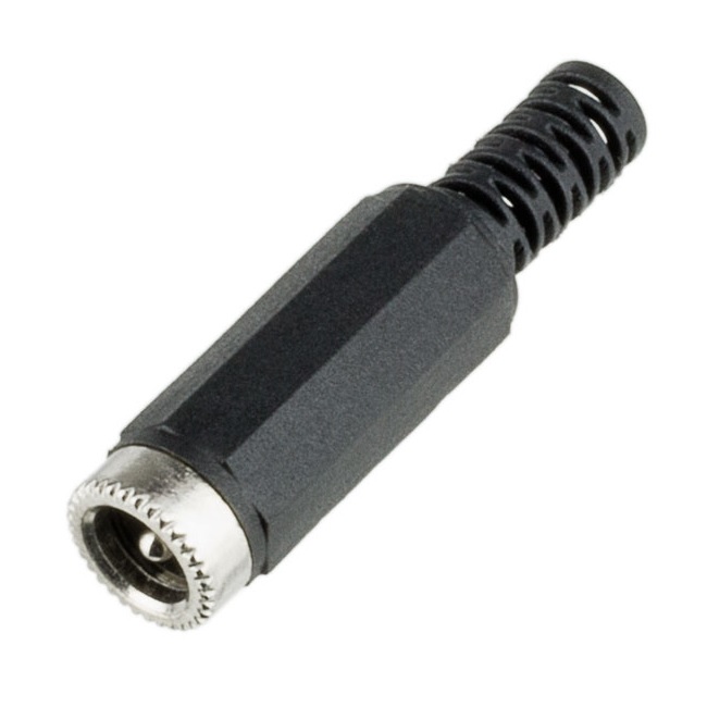 This barrel jack plug is great for adding a common connector to the end of our wires. This jack is compatible with 5.5mm barrel jacks that have a 2.5mm center pole diameter. The outer shell unscrews to reveal solder terminals and a crimp strain relief. The outer shell has strain relief as well.