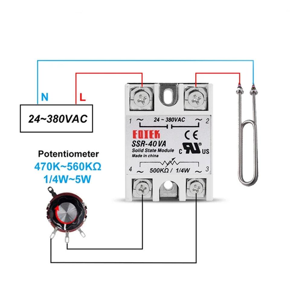 In this particular SSR, the power output is controlled by the trigger angle of the trial with a variable resistor of 500KΩ. Each one of these relays is equipped with four screw terminals (for use with ring or fork connectors) and a plastic cover that slides over the top of the relay to protect the terminals.