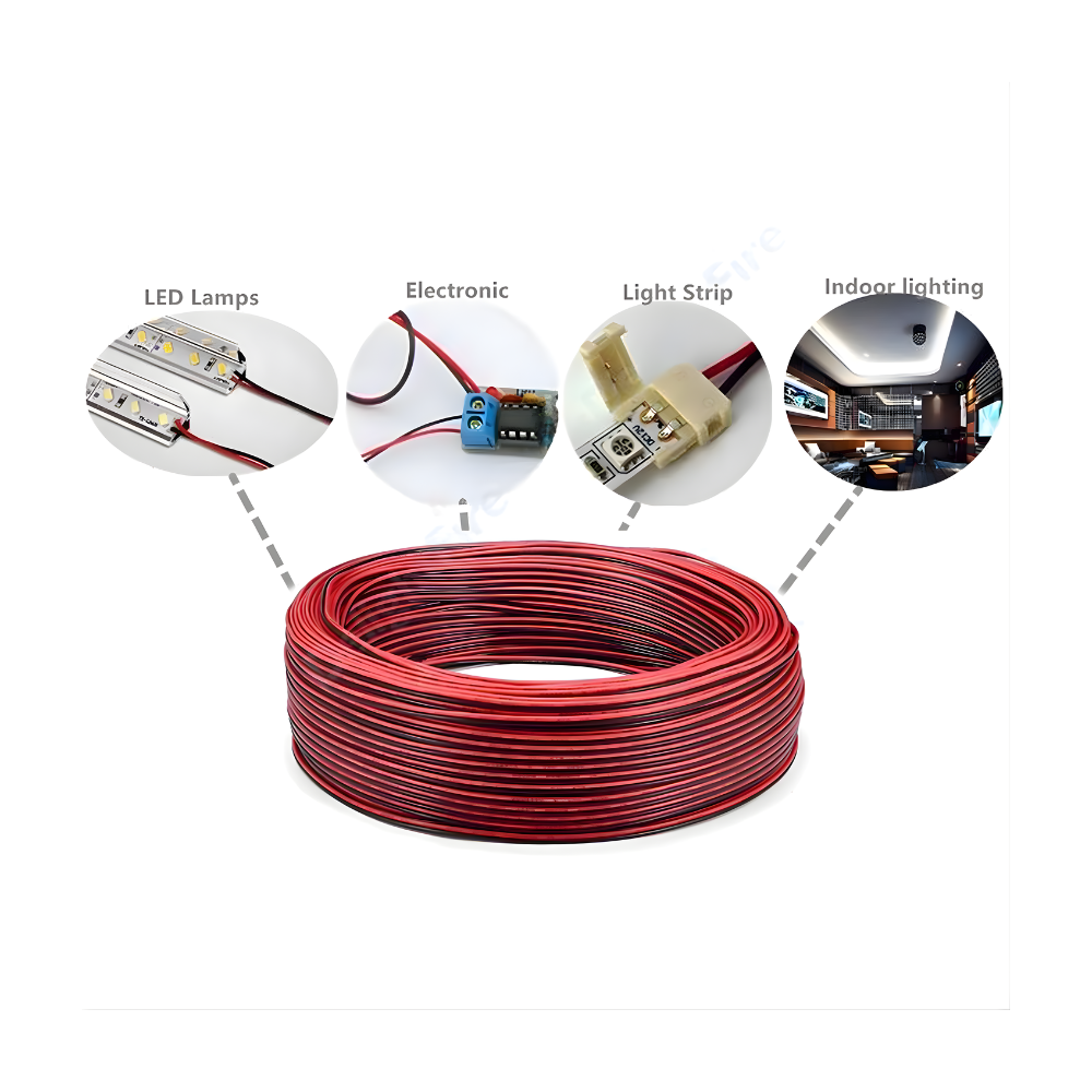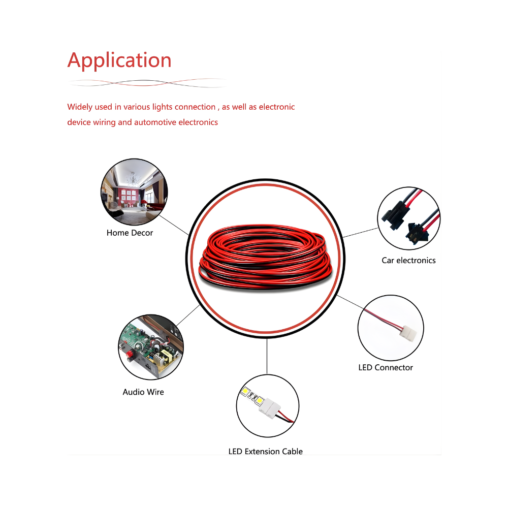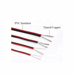 The 2 Pin Electrical Wire is a thin, flexible, and durable cable designed for low-current electronic and LED applications. It consists of two color-coded conductors — red (positive) and black (negative) — made from high-quality tinned copper, providing excellent electrical conductivity and corrosion resistance. The wire is covered with PVC insulation, offering protection against heat, moisture, and wear while maintaining flexibility.
