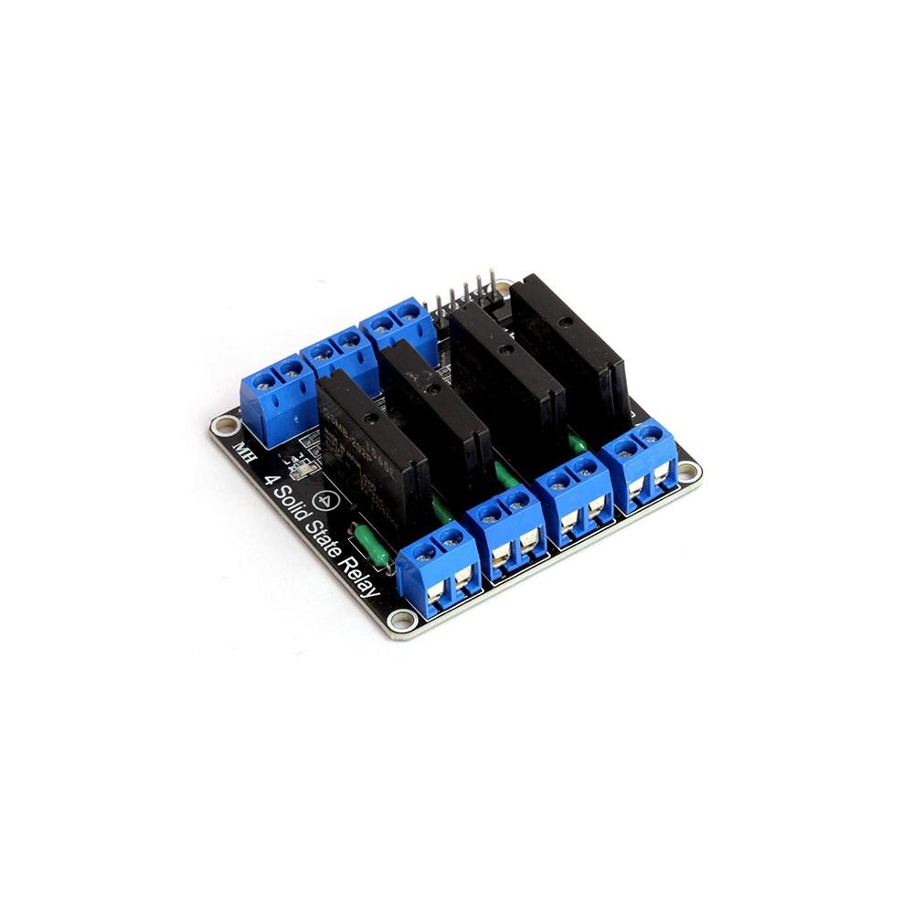 This is 4 Channel 12V Solid State Relay Module. A solid-state relay (SSR) is just what it sounds like; an IC that acts like a mechanical relay. They allow you to control High-voltage AC loads from lower voltage DC control circuitry. They accomplish this by using infrared light as the contact, a solid-state relay is really just an IR LED and a photo Triac sealed up into a little box. Solid-state relays have several advantages over mechanical relays.