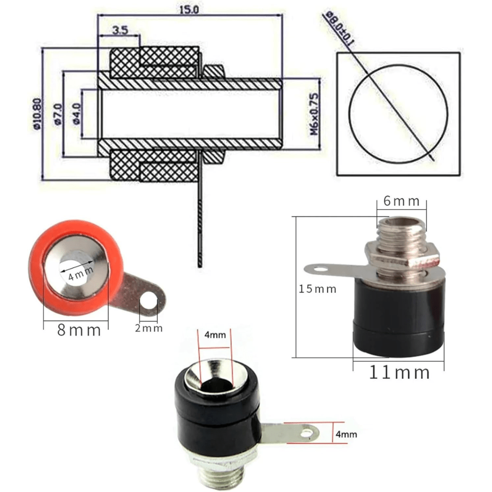 4mm Banana Socket Jack for Banana Plug Terminal Connector is a 4mm banana plug spade connector. The connector is a nickel-plated aluminium alloy core with a hard plastic shell for insulation. This makes it durable and has a stable performance.