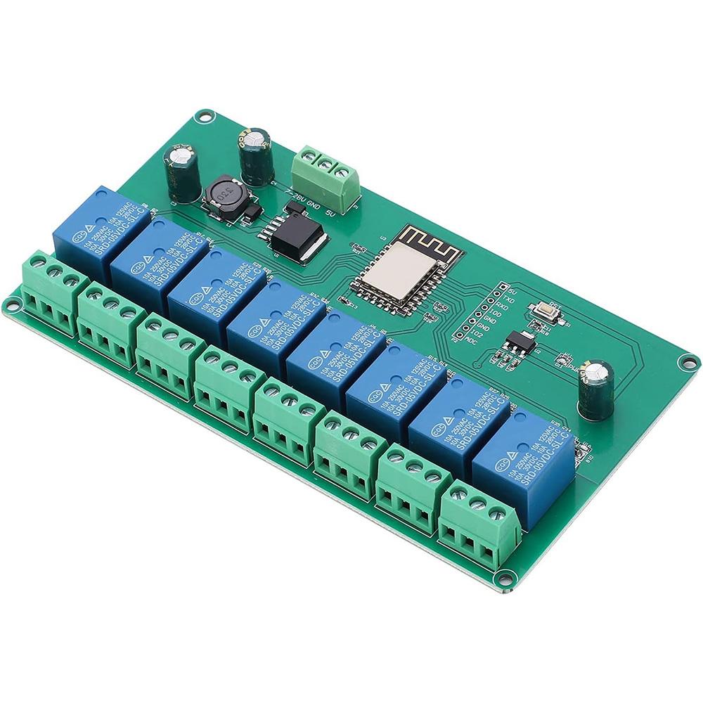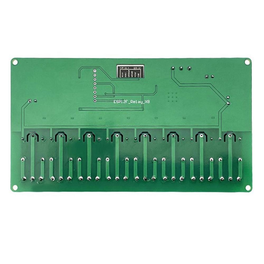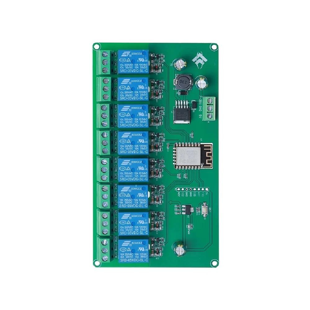 The ESP8266 eight-way relay development board is equipped with an ESP-12F WiFi module and supports DC7-28V/5V power supply. Provide Arduino development environment reference code, suitable for ESP8266 secondary development learning, smart home wireless control and other occasions.