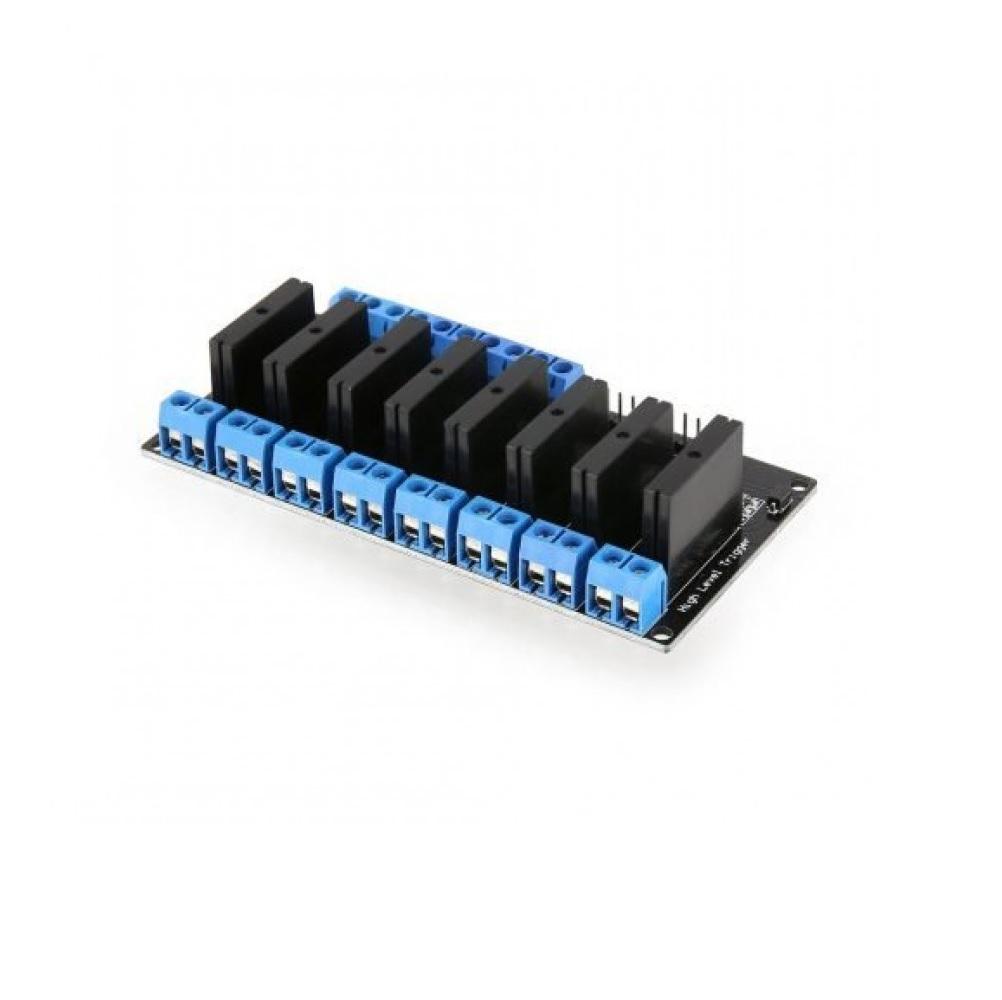 This 24V 8 Channel SSR Solid State Relay Module 250V 2A Output with Resistive Fuse is based on the Omron G3MB -202P SSR relay which can control up to 2A at 240VAC. This is a 6 Channel SSR relay module, each relay channel has 3 separate terminals, NO (Normal Open), COM (Common), NC (Normal Closed).