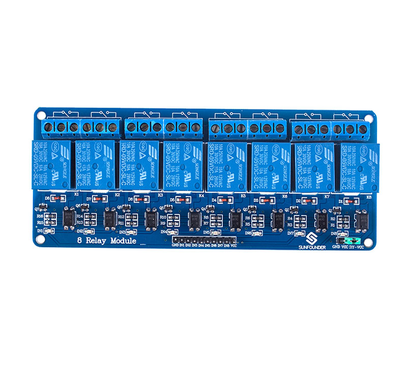 This is a 8-channel LOW level trigger relay and it can be applied to Arduino and Raspberry Pi. Relays are suitable for driving high power electronic devices such as lights, electric fans and air condition. A relay can be used to control high voltages with a low voltage by connecting it to an MCU.