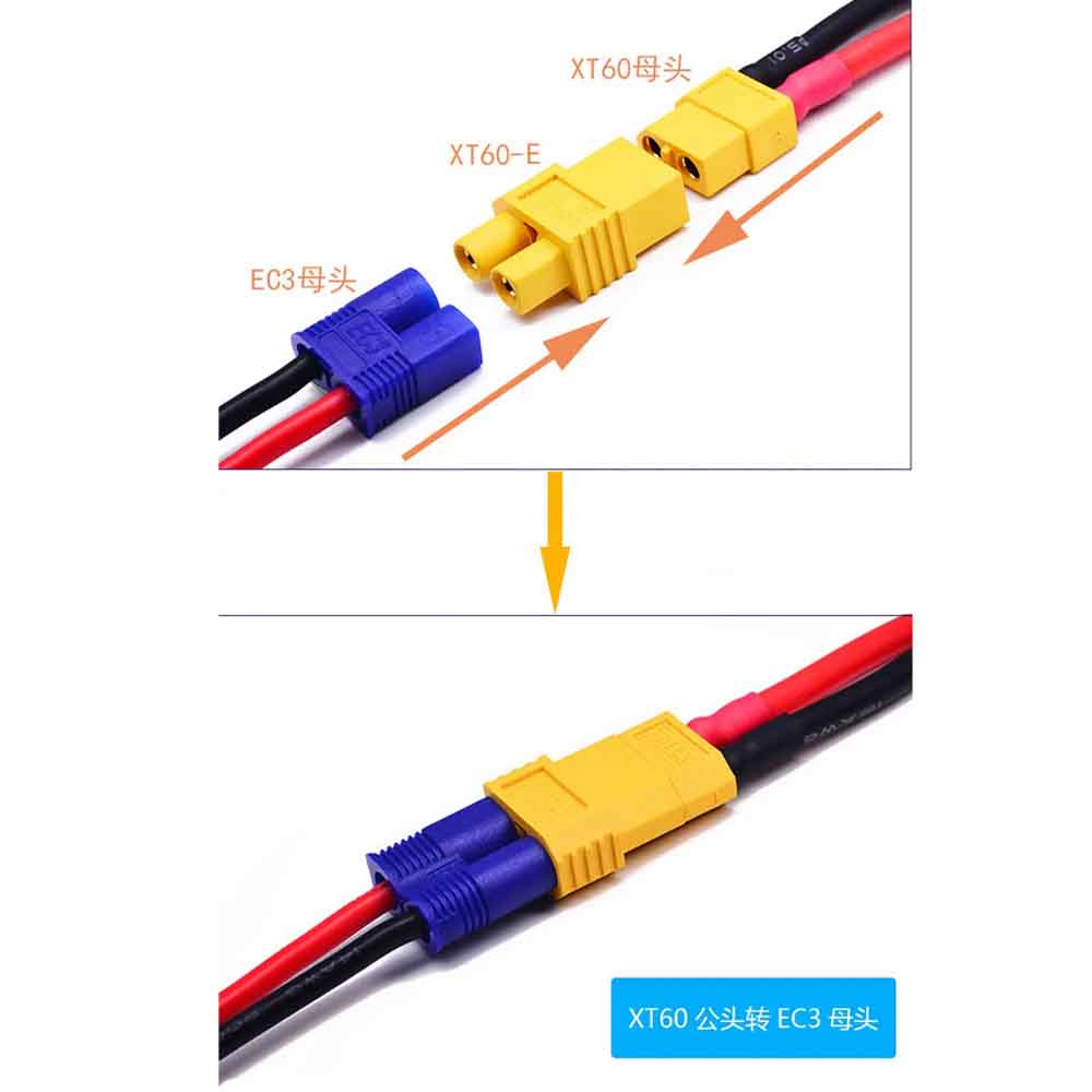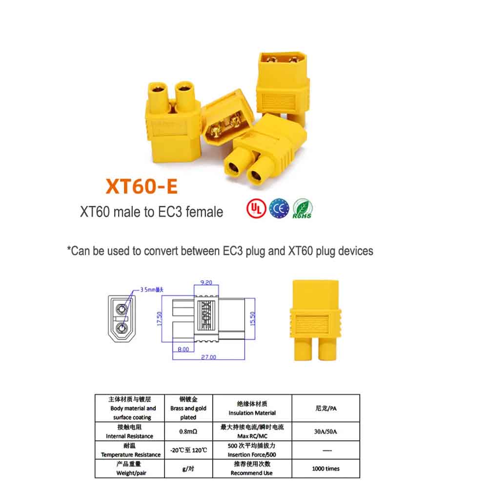 The EcXT60-E conversion plug connector is designed to allow compatibility between an EC male connector and an EC3 female connector. It facilitates seamless connection and conversion between devices using these specific connector types, ensuring efficient and reliable electrical connectivity.