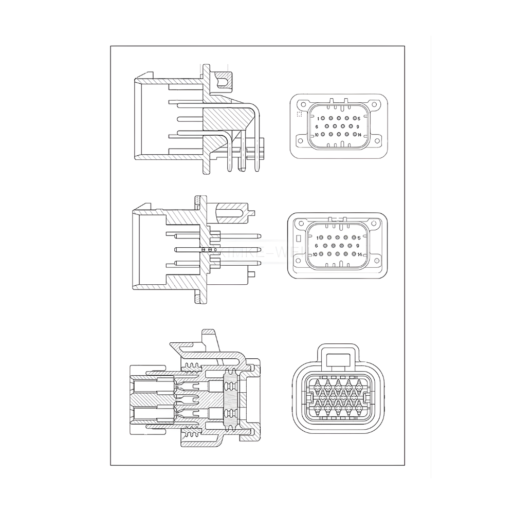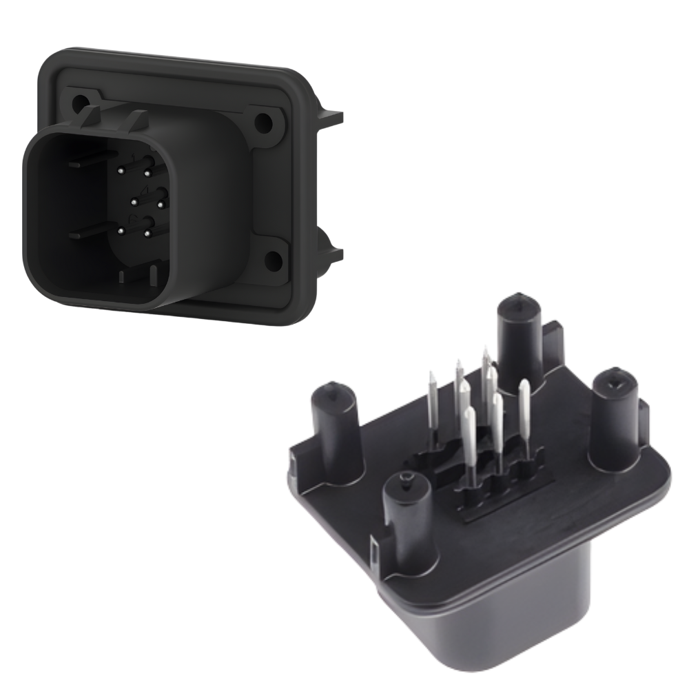 The 8 Pin AMPSEAL Vertical Male Automotive Connector is a sealed, durable connector designed for automotive and industrial applications. It mounts vertically on a PCB and connects securely with the mating female receptacle. Its rugged design ensures reliable performance in harsh environments such as engine compartments, providing protection against dust, moisture, and vibration.