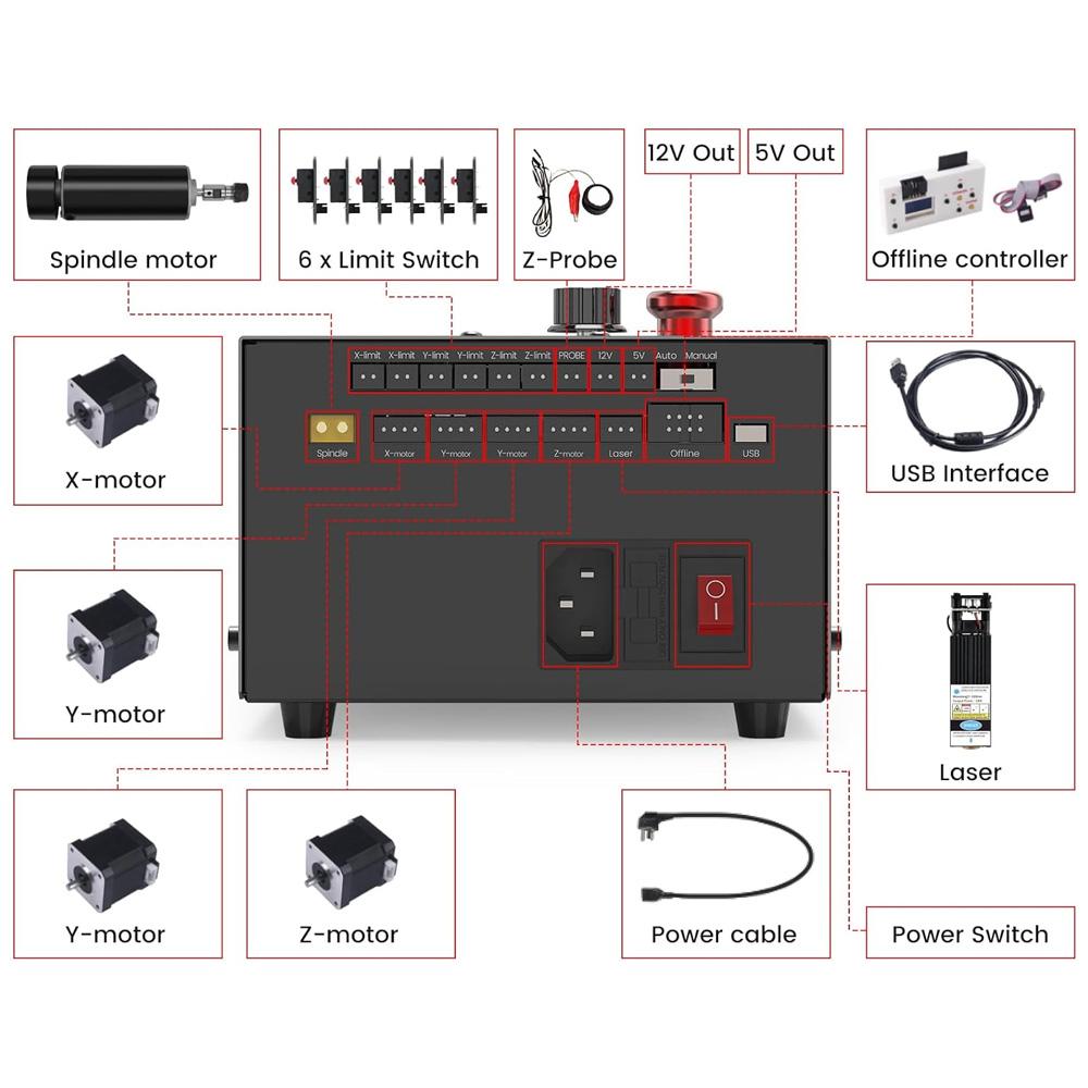 • Enhance Safety: The control box supports emergency stop, pause running, continue running, reset, and manual adjustment of spindle speed function, can be adapted to 3020PLUS, 4540, 3018MAX
