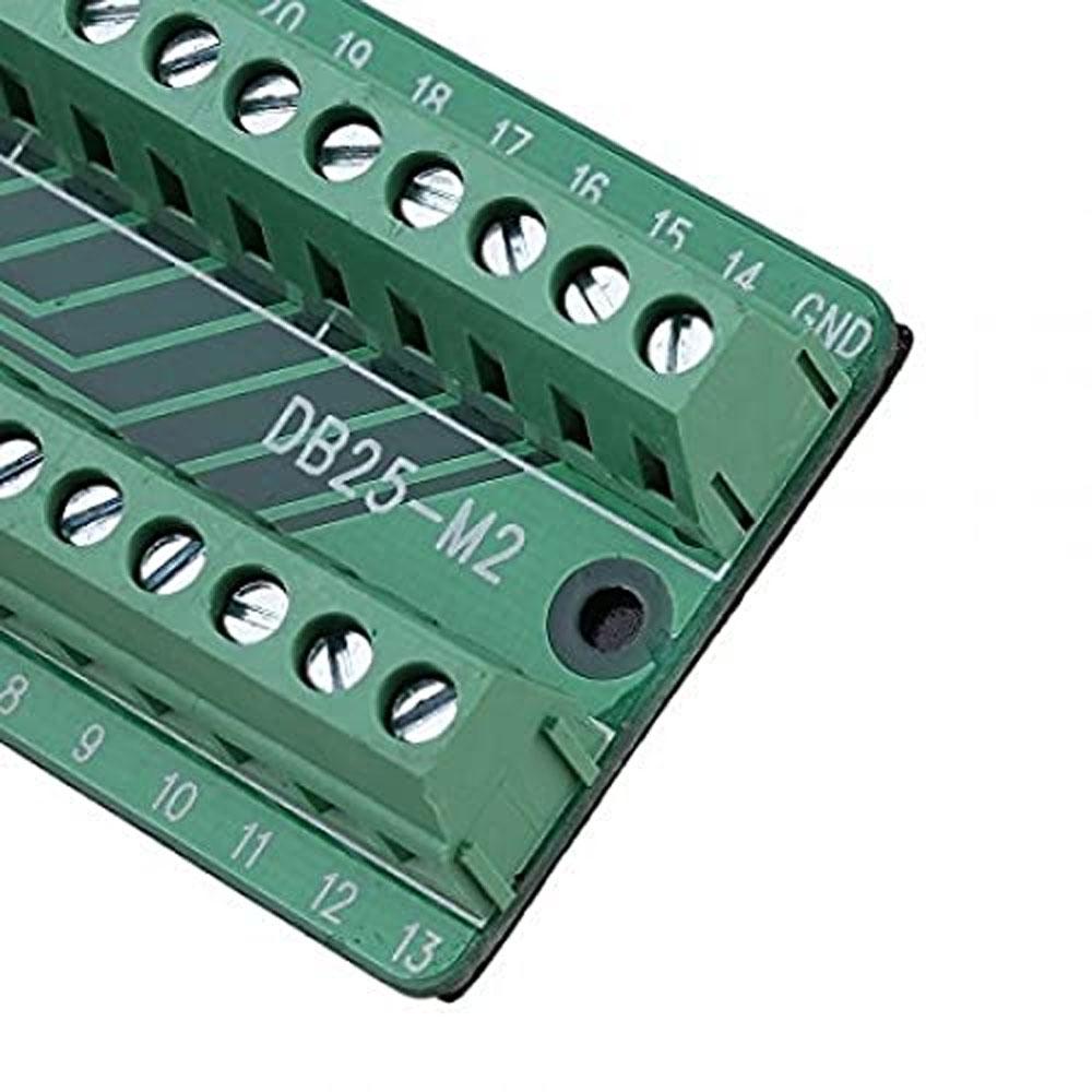 DB25-M2 DB25 to Terminal with Nut Adapter used for communication debug. With 25 pcs signal line was all lead out, name and number clearly labeled; The terminal spacing of connector is 3MM, screw hole diameter 2.5MM, need to use a width of 2.5MM screwdriver for assembly, terminals can accept 24-12AWG Wire and max 10A current. The connector uses the environmental friendly copper terminals. it also has an insulated 3 mm thickness pad at the bottom.