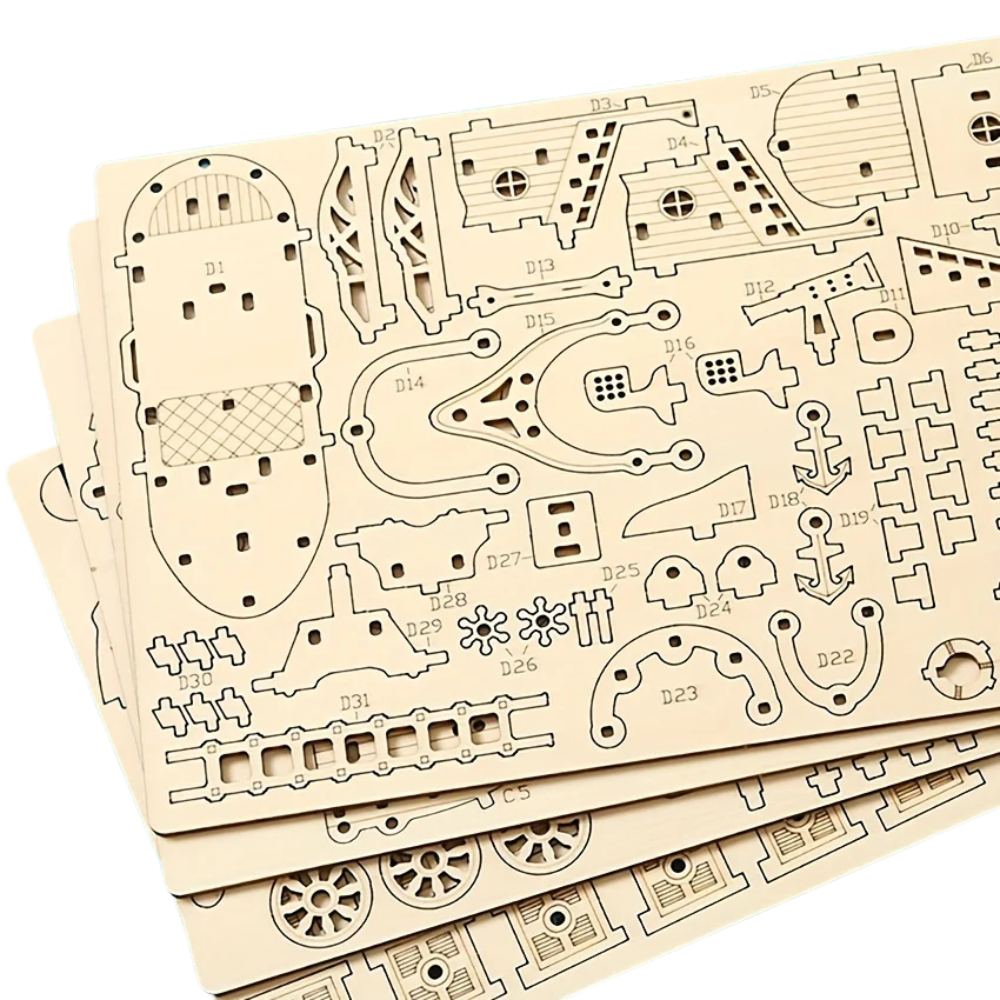 • Pieces Count: Approx. 200–300 precision-cut wooden parts (varies by model)