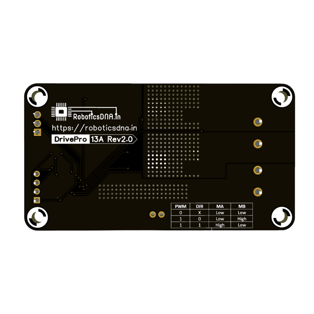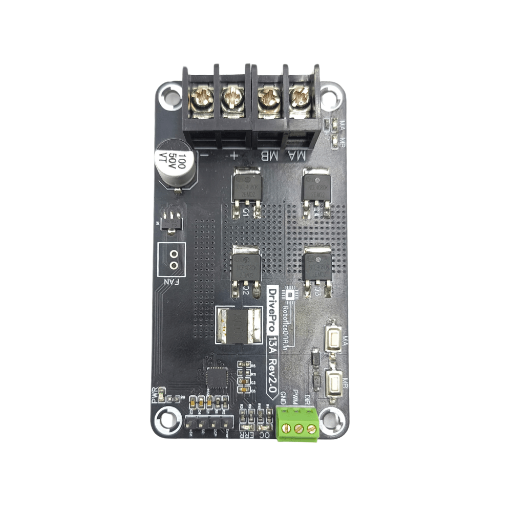 The DrivePro13A is a high-performance 13A DC motor driver, designed for reliable and efficient control of high-current brushed DC motors. It supports bi-directional control, operates within a 7V–30V range, and handles up to 30A peak current for short durations. Featuring a full NMOS H-Bridge, it ensures low heat dissipation, fast response times, and high efficiency without requiring an external heat sink. Compatible with 3.3V and 5V logic signals, it seamlessly integrates with Arduino, Raspberry Pi, and other microcontrollers.