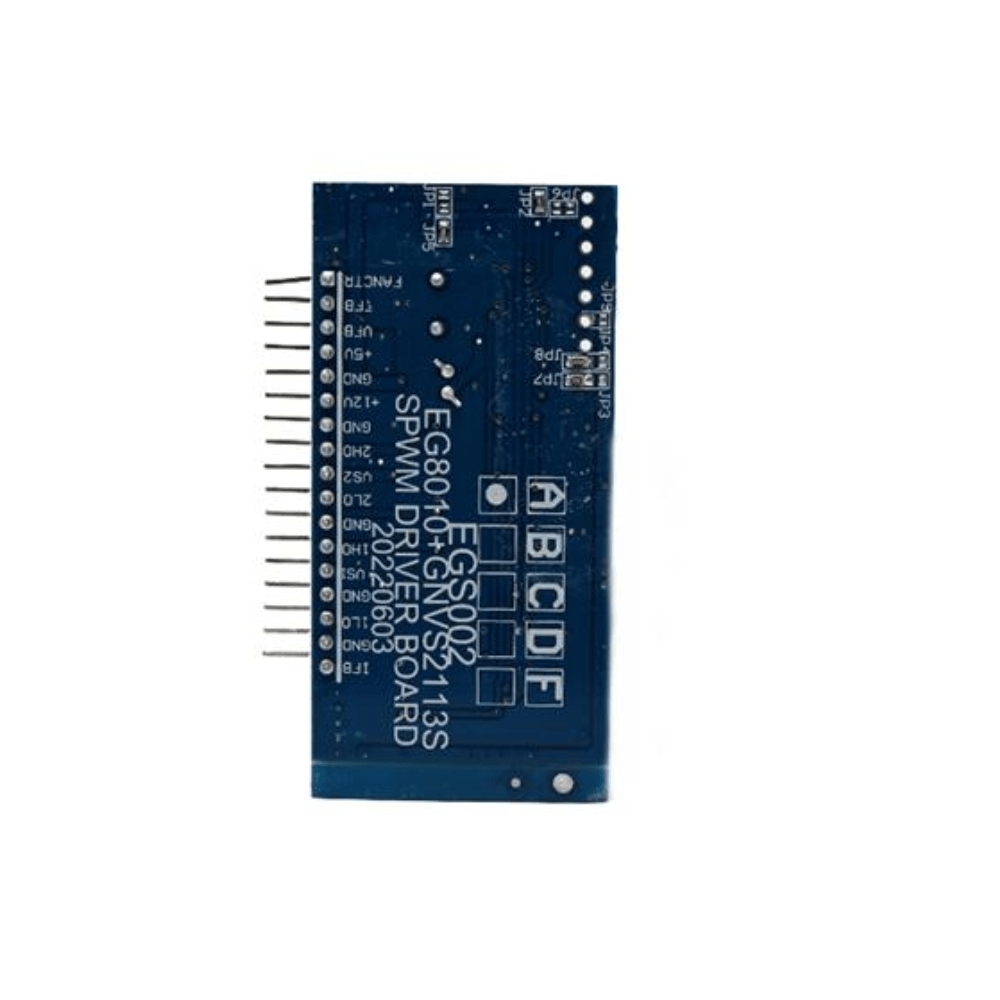 EGS002 is a driver board-specific for single-phase sinusoid inverter. It uses ASIC EG8010 as control chip and IR2110S as driver chip. The driver board integrates functions of voltage, current and temperature protection, LED warning indication and fan control. Jumper configures 50/60Hz AC output, soft start mode and dead time. EGS002 is an improved version of EGS001 that is compatible with EGS001’s original interfaces. EGS002 also integrates cross-conduction prevention logic to