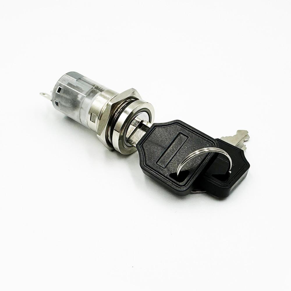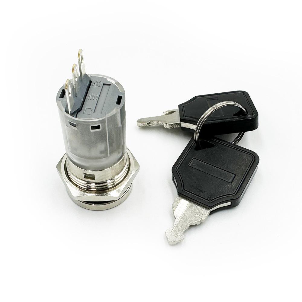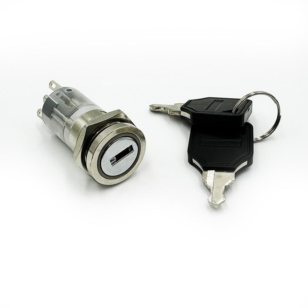 The key lock switches we supplied are used as electronic switches to control the circuit ON/OFF, not mechanical locks. They are used in computer locking and other security systems. Our key switches’ cut-out mounting diameters included 16mm size key switches only with the ON/OFF function. 16mm  ON/OFF with latching or momentary. All of our keylock switches have common keys and are non-waterproof.
