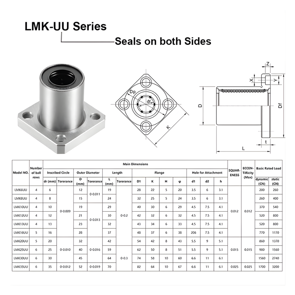 The LMK25UU is a square flange linear ball bearing designed for smooth and accurate linear motion along a 25 mm shaft. Its square flange makes it easy to mount securely on flat surfaces, ensuring perfect alignment and reducing unwanted rotation during operation.