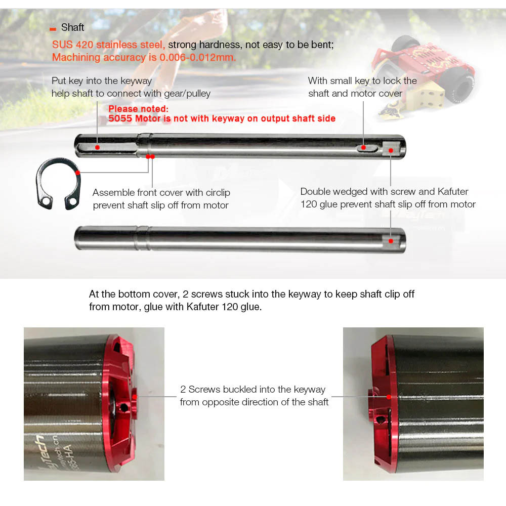 Maytech motors are designed for running clockwise or counterclockwise. To change the turning direction, you just simply exchange 2 of the 3 cables. Motors provide high efficiency stator design.  Mount your motor with the included screws tightly on your front cover of model.