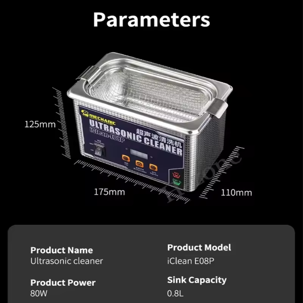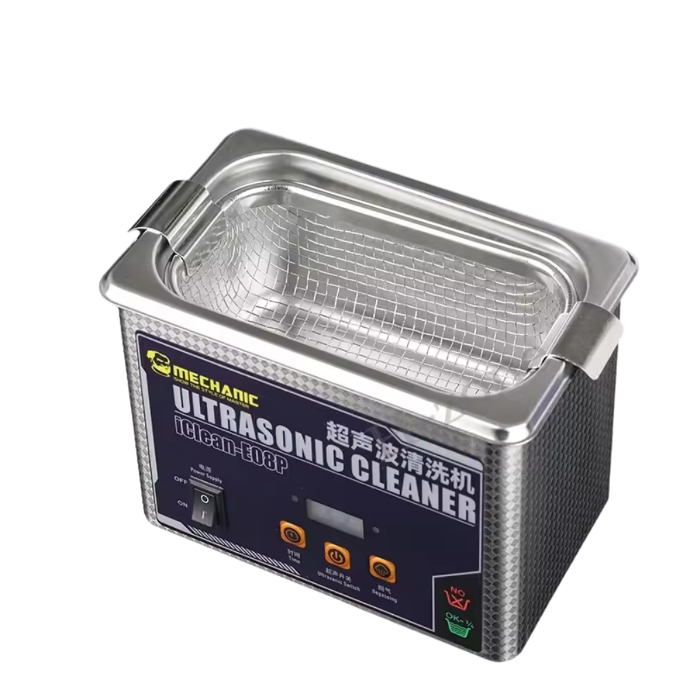 The MECHANIC iClean-E08P Ultrasonic Cleaner is a compact, high-frequency cleaning machine specifically engineered for precision cleaning in the mobile phone and electronics repair industry. It features a 0.8-Liter capacity and operates with an 80W power output and a 40KHz ultrasonic frequency to deliver 360° deep cleaning that removes contaminants like paint, grease, dye, rust, dust, and fingerprints without damaging delicate components.