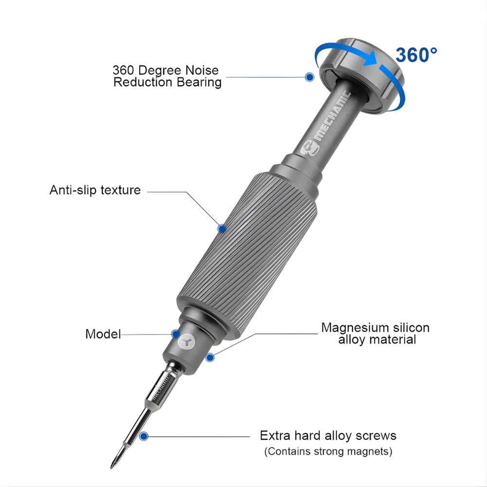 It features a durable, non-slip handle often made from a lightweight Magnesium Silicon Alloy, offering an ergonomic and comfortable grip essential for prolonged and precise tasks. The screwdriver is primarily recognized for its 1.2mm Phillips (Cross) bit, which is forged from robust, extra-hard S2 steel known for its exceptional toughness and resistance to wear. A key functional attribute is its powerful magnetic tip, designed to securely hold tiny screws in place, thereby significantly reducing the frustration and risk of losing small components during disassembly or assembly. Furthermore, many models incorporate precision rotation bearings in the cap, allowing for smooth, low-noise, and effortless turning, making the Mechanic iShell Mortar Mini 1.2 an indispensable tool for the repair and maintenance of smartphones, tablets, cameras, and other demanding precision electronics.