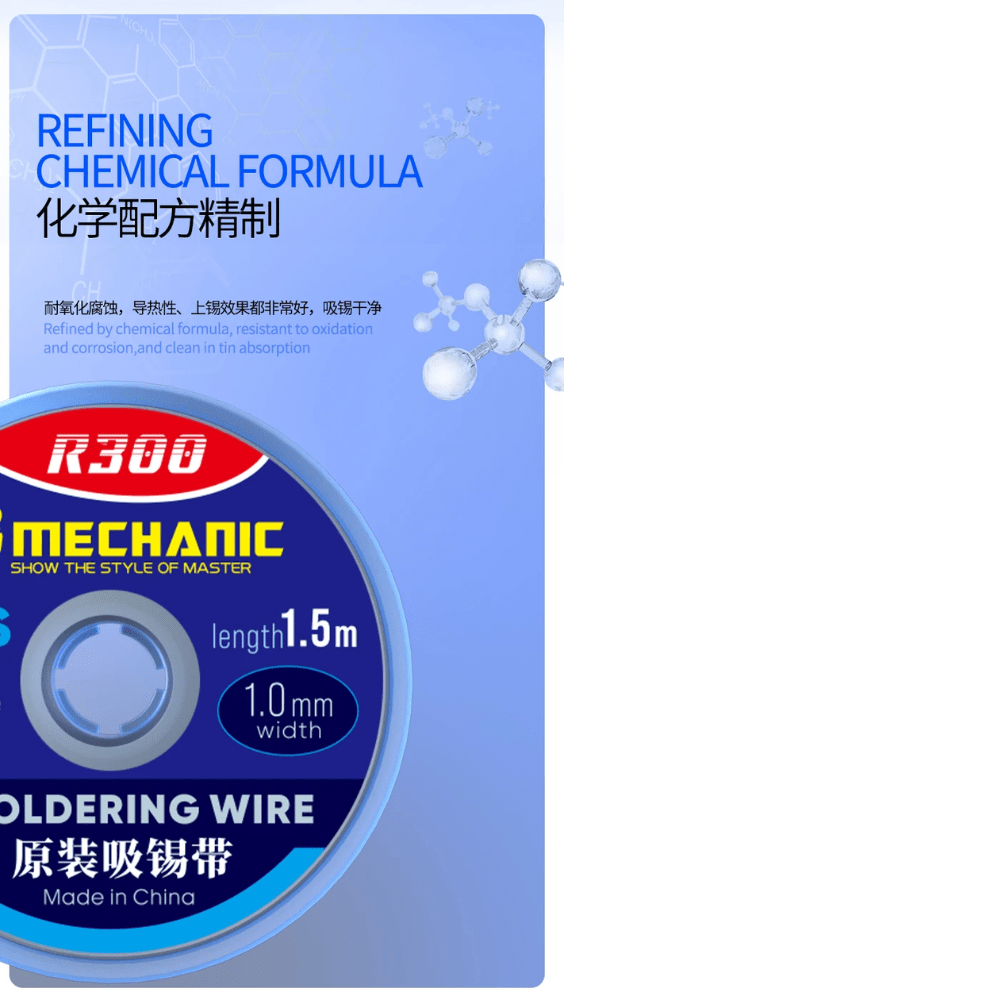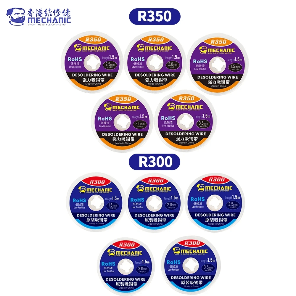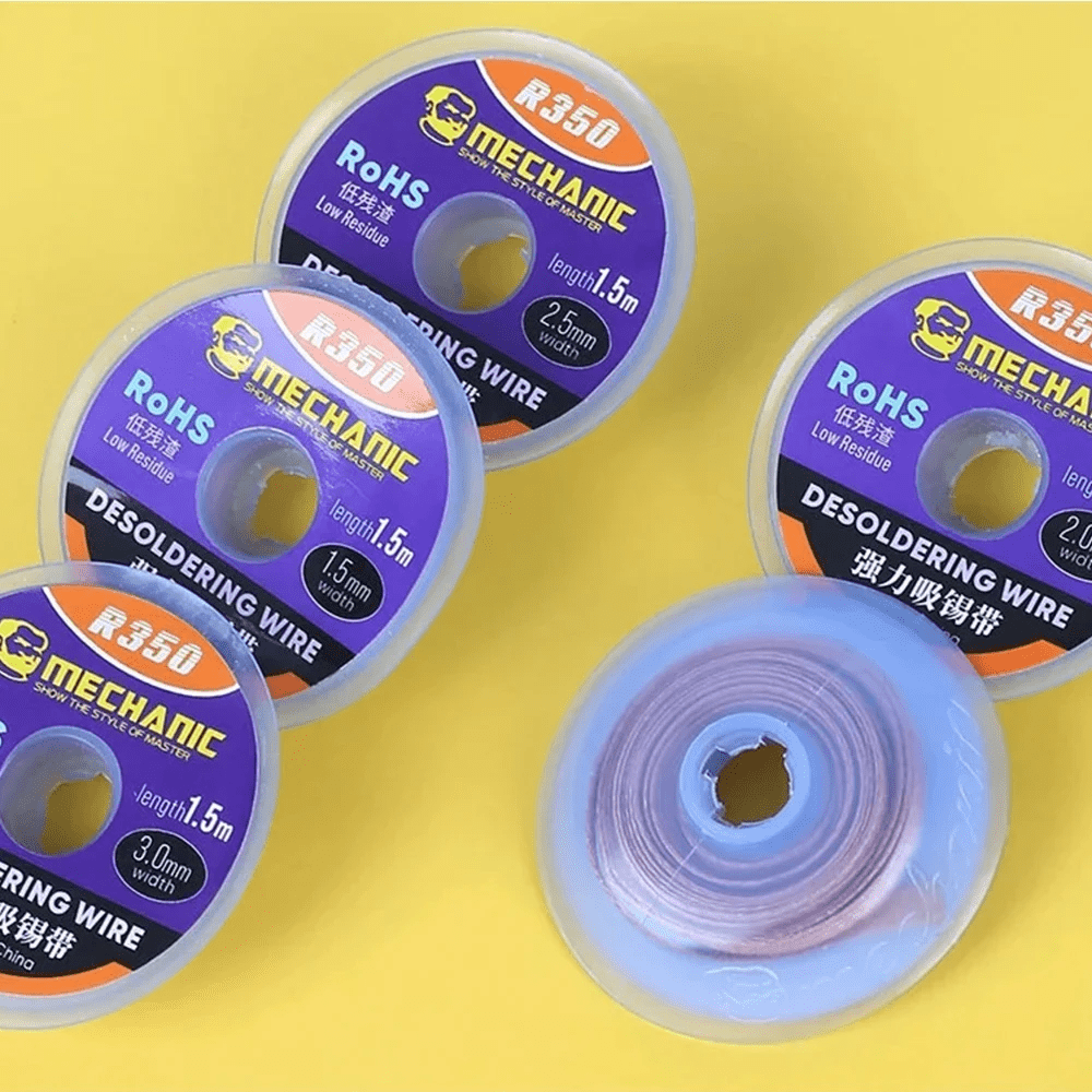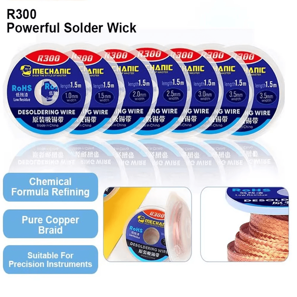 The MECHANIC R300 Suction Solder Wick is an essential desoldering tool designed for efficient removal of solder from PCBs and electronic components. With a width of 3.5mm and a length of 1.5 meters, this desoldering braid is perfect for both professional technicians and DIY enthusiasts seeking to clean up old solder joints or rework circuit boards.