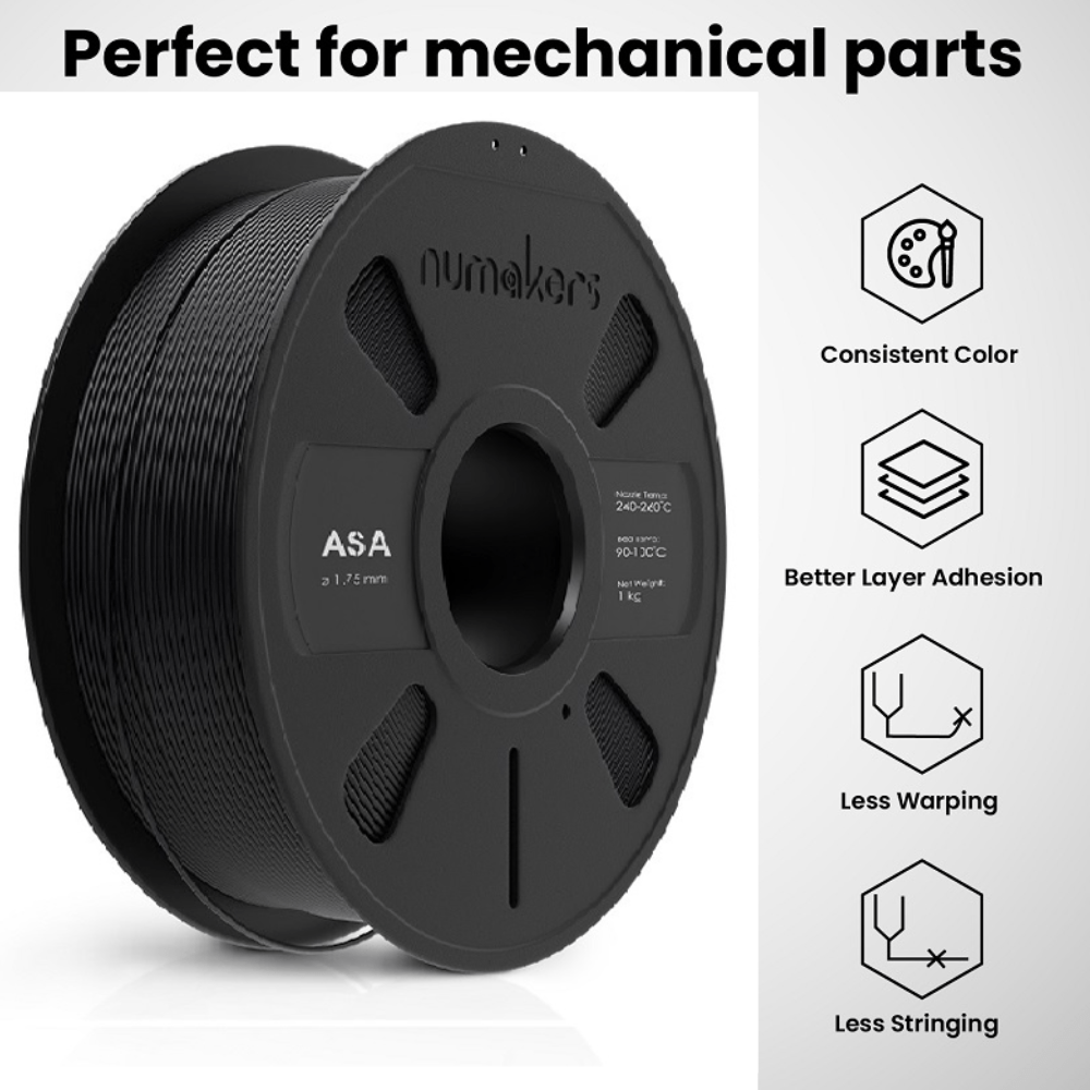 Numakers ASA 3D printing filaments are made of high-purity Acrylonitrile Styrene Acrylate pellets. They are the perfect choice for achieving technical-looking prints with exceptional durability and chemical, temperature & UV resistance. It is ideal for projects exposed to sunlight and the elements, relied upon by industries like automotive, marine, and RV.ASA is easy to print, offering enhanced durability and a sleek finish compared to ABS.