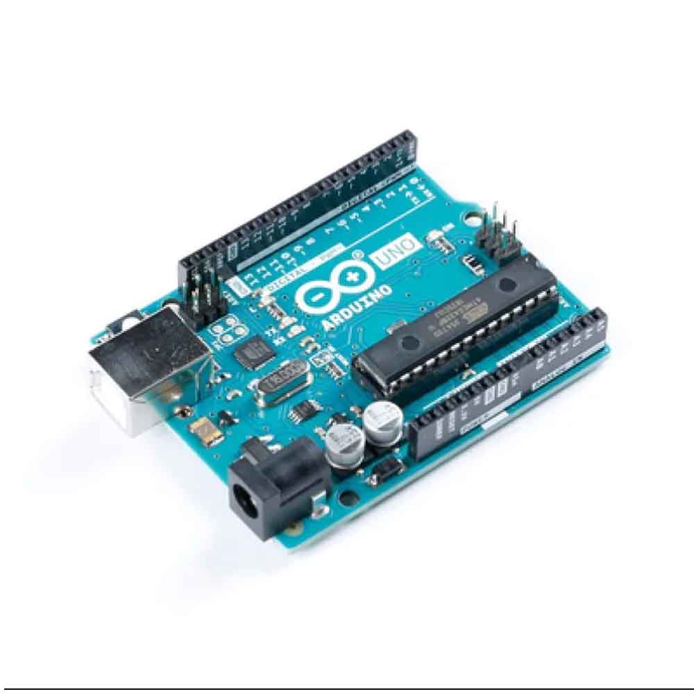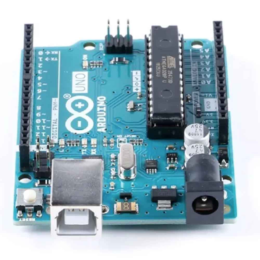 The Arduino Uno is a microcontroller board based on the ATmega328. It has 14 digital input/output pins (of which 6 can be used as PWM outputs), 6 analog inputs, a 16 MHz ceramic resonator, a USB connection, a power jack, an ICSP header, and a reset button. It contains everything needed to support the microcontroller; simply connect it to a computer with a USB cable or power it with an AC-to-DC adapter or battery to get started. The Uno differs from all preceding boards in that it does not use the FTDI USB-to-serial driver chip. Instead, it features the Atmega16U2 (Atmega8U2 up to version R2) programmed as a USB-to-serial converter. Revision 2 of the Uno board has a resistor pulling the 8U2 HWB line to the ground, making it easier to put into DFU mode.