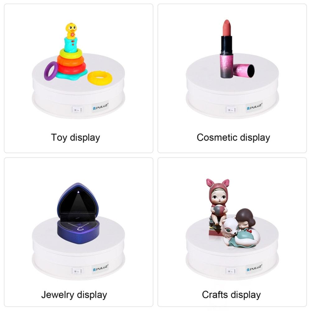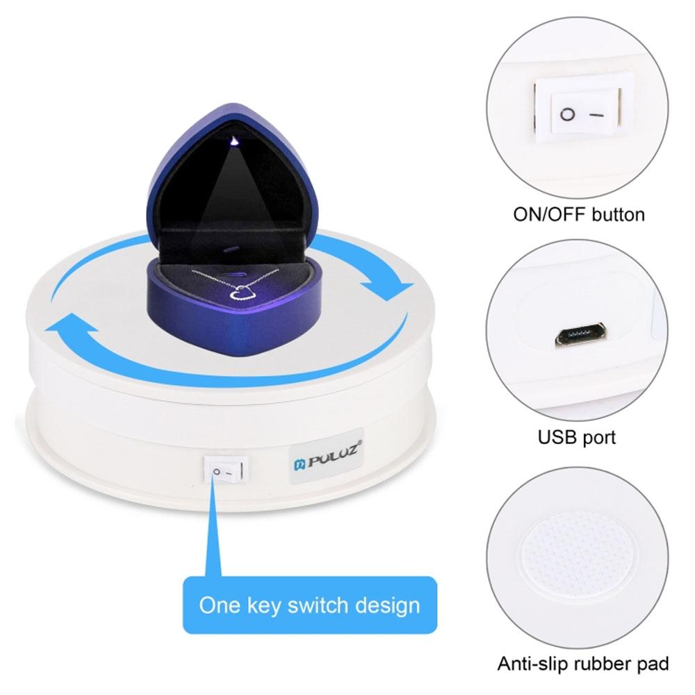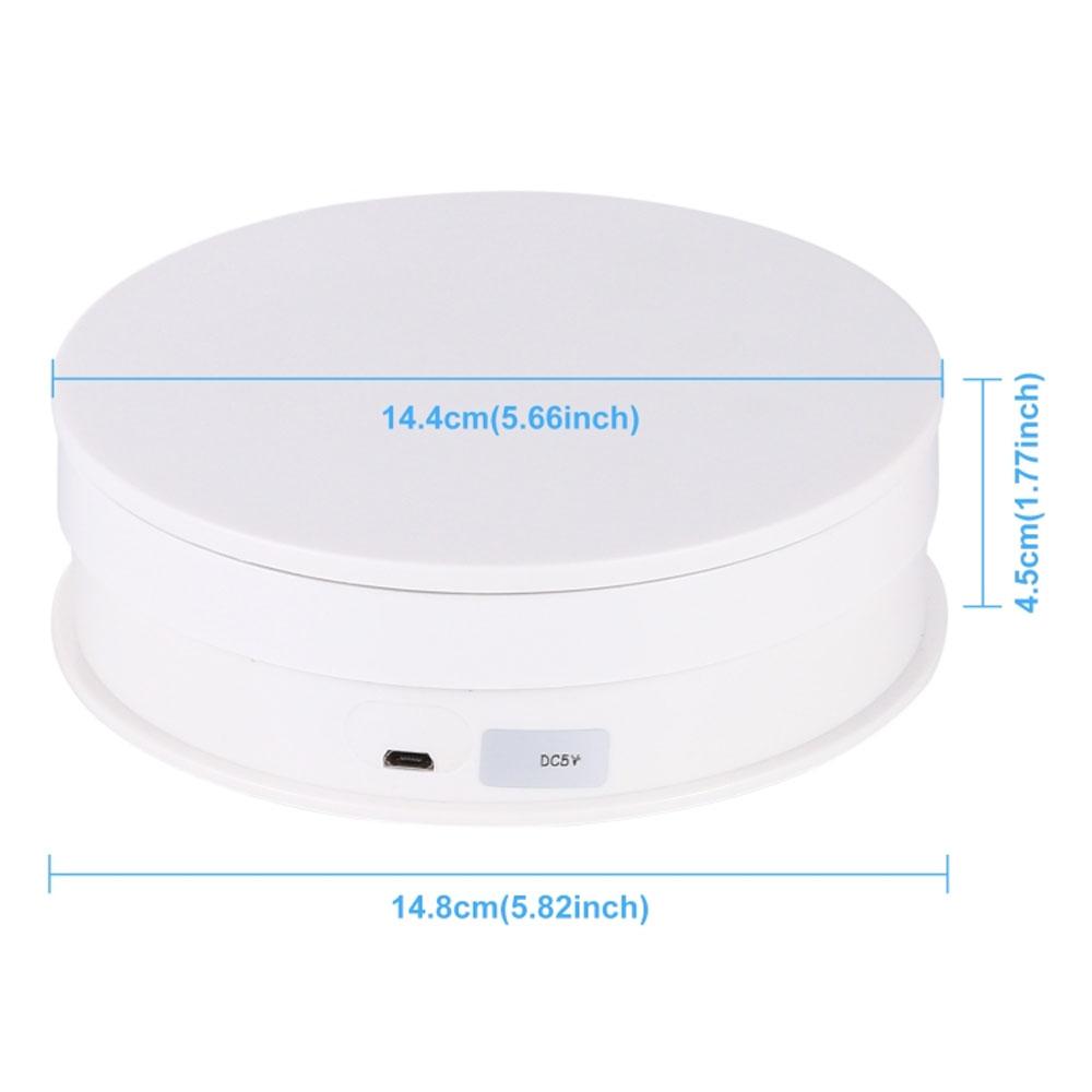 The PULUZ 15cm USB Electric Rotating Turntable is a compact, White display stand designed for photography and video shooting. It features a smooth, automatic rotation, making it ideal for showcasing products from all angles. With a load capacity of 1-5kg, it is perfect for displaying small to medium-sized items. The turntable is powered via USB, offering convenience and ease of use for professional and hobbyist photographers alike.