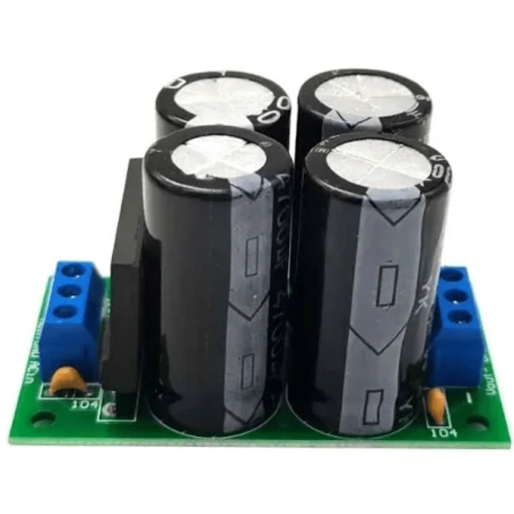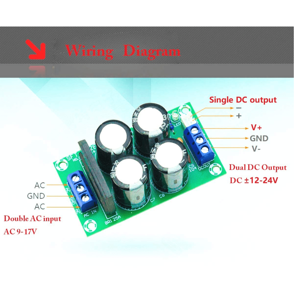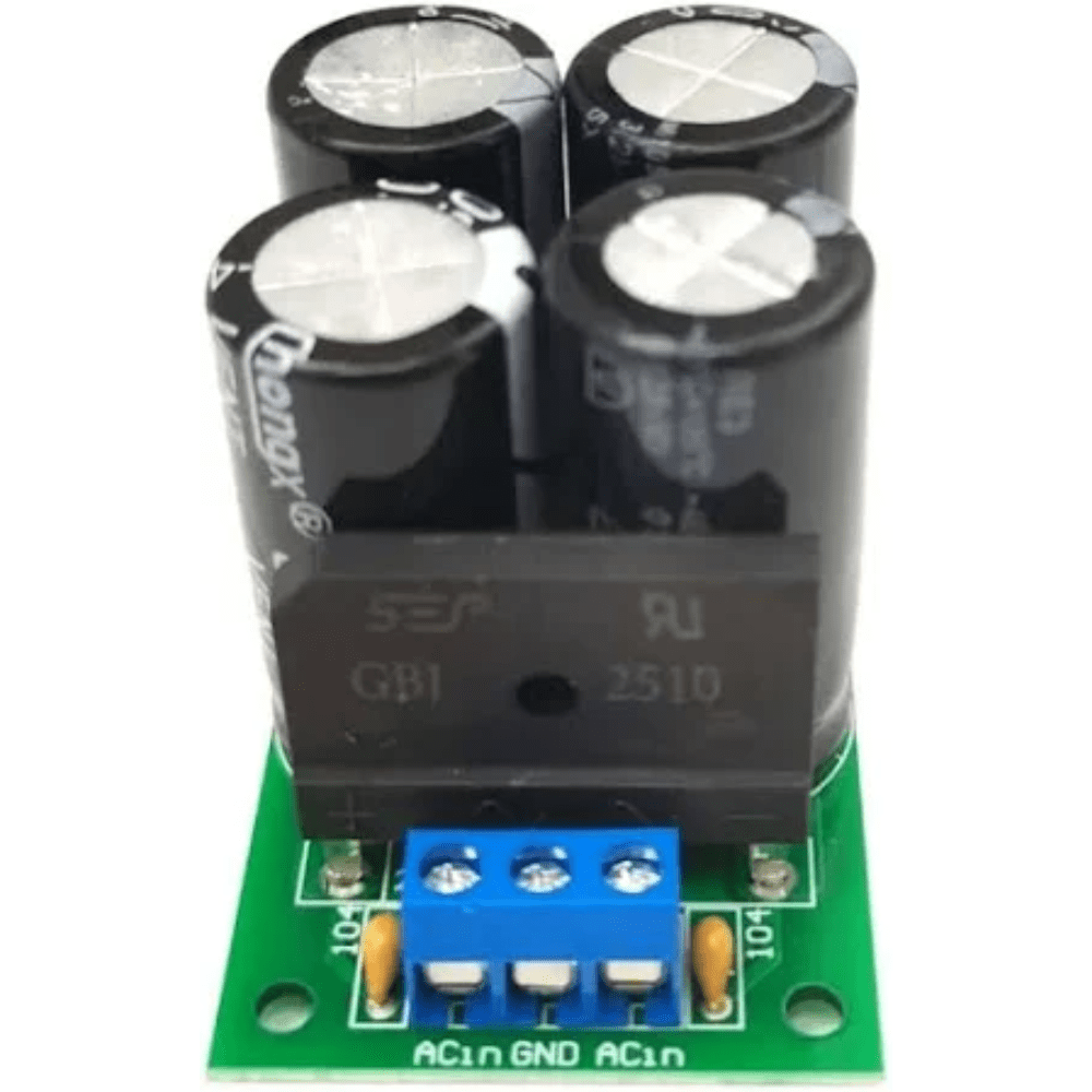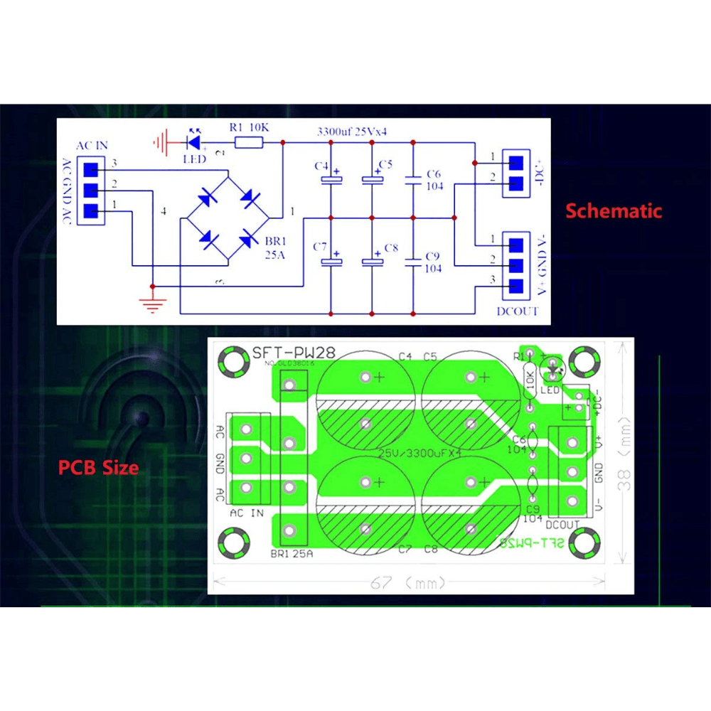 Four 25V3300uf/35V3300uf electrolytic capacitors are much more efficient to rectify all signals and glitches. The 35V3300uf version is suitable for the requirement that the output voltage does not exceed ±25V. The output DC voltage is about 1.4 times of the input AC voltage. For example, the input AC is 18V, the output is ±25V, and the input single/double AC will output DC positive and negative dual voltages.