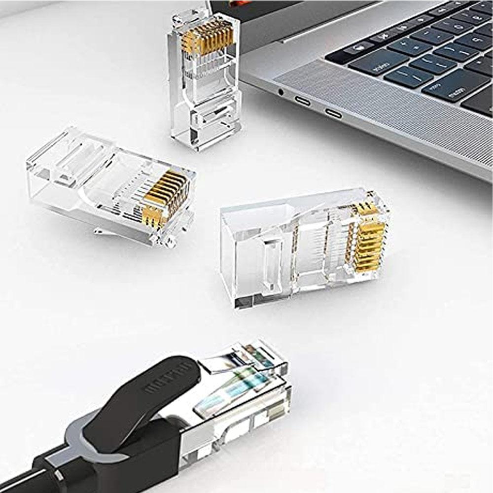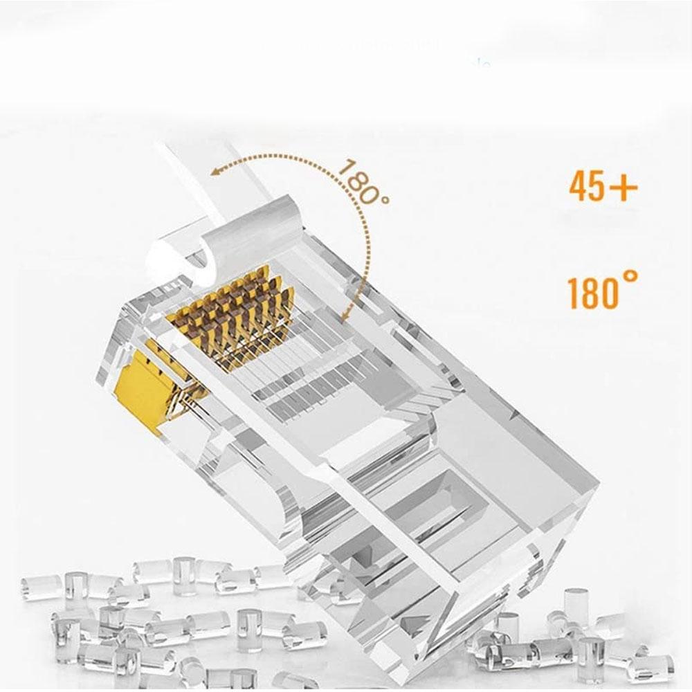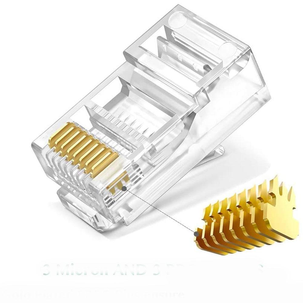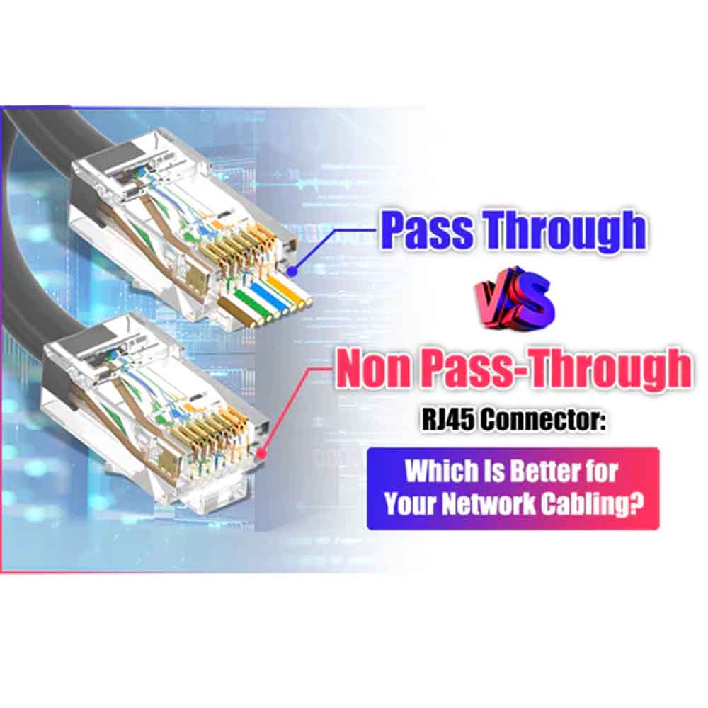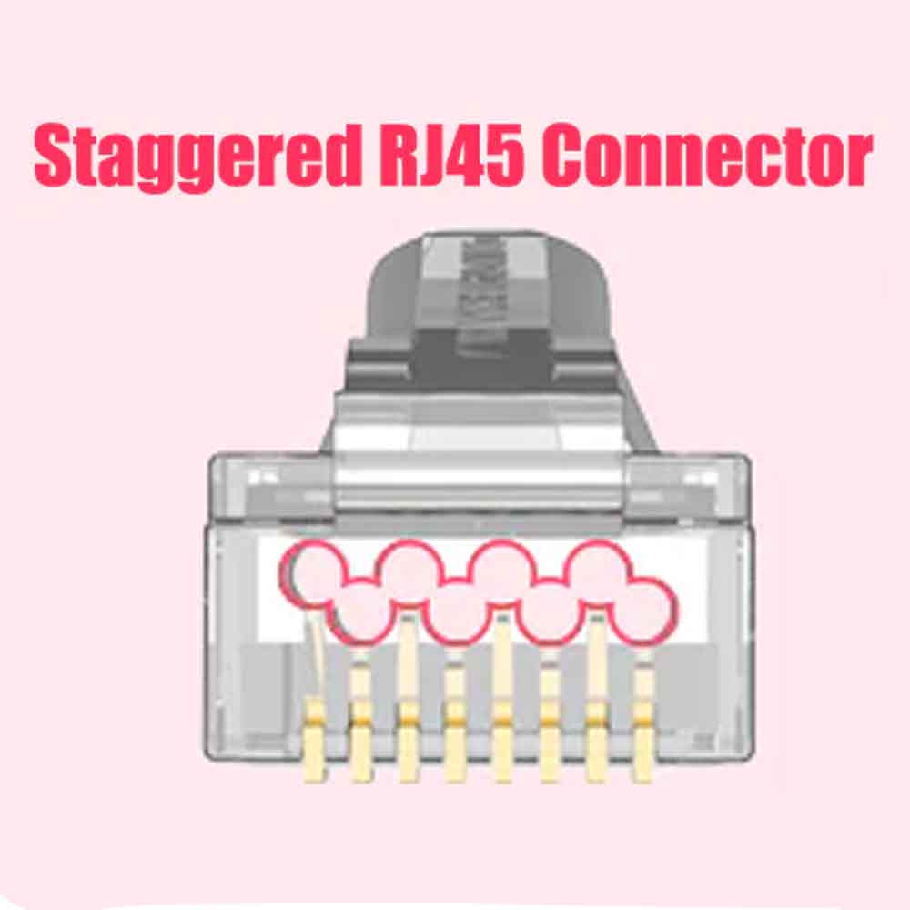 The RJ45 modular plug allows the LAN cable wire conductors to pass completely through and out the front of the plug body. This allows the installer to easily verify the wire pattern alignment before terminating or crimping the plug.