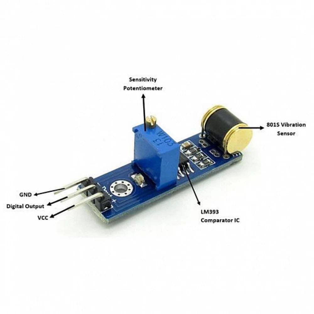 This module 801S adjusts its level of resistance once the vibration is detected. If the vibration is high, it can turn into a switch. It is gold-plated and can withstand 60 million shocks, according to the datasheet. This module is connected to a voltage divider which can be measured by means of a digital pinout. It is a high-sensitivity 801S Vibration Sensor module with one digital output pin(D0). When it detects some vibration up to a certain threshold, it can output a High or Low level.