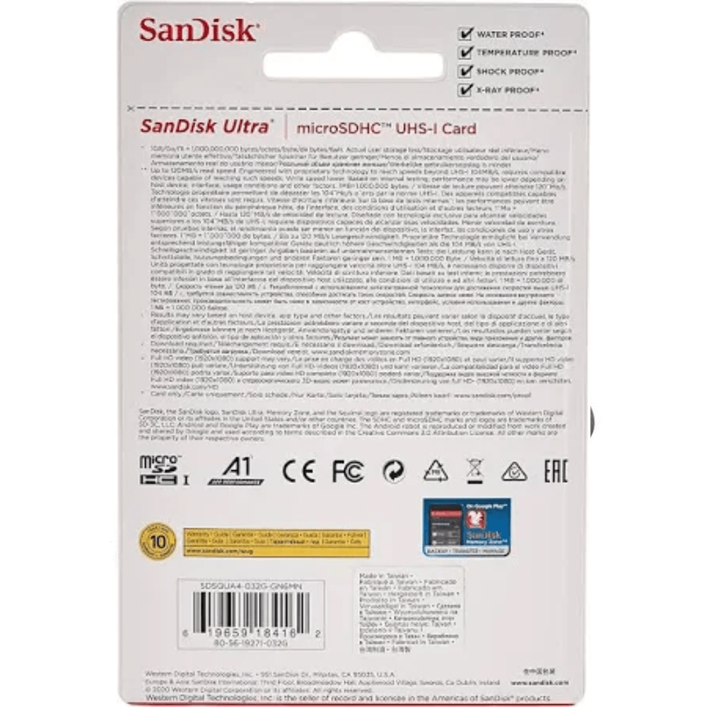 Give the power to your project with Sandisk Micro SD/SDHC 32GB Class 10 Memory Card. A1 series memory card, new and made for APP or operating system to load and run faster and smoother ever before. With speed up to 120MB/s Shoot, save, and share more with high speed. Built to perform in harsh conditions, SanDisk Ultra microSD UHS-I cards are Moisture proof, temperature proof, shockproof, and X-ray proof.