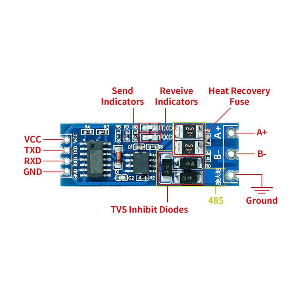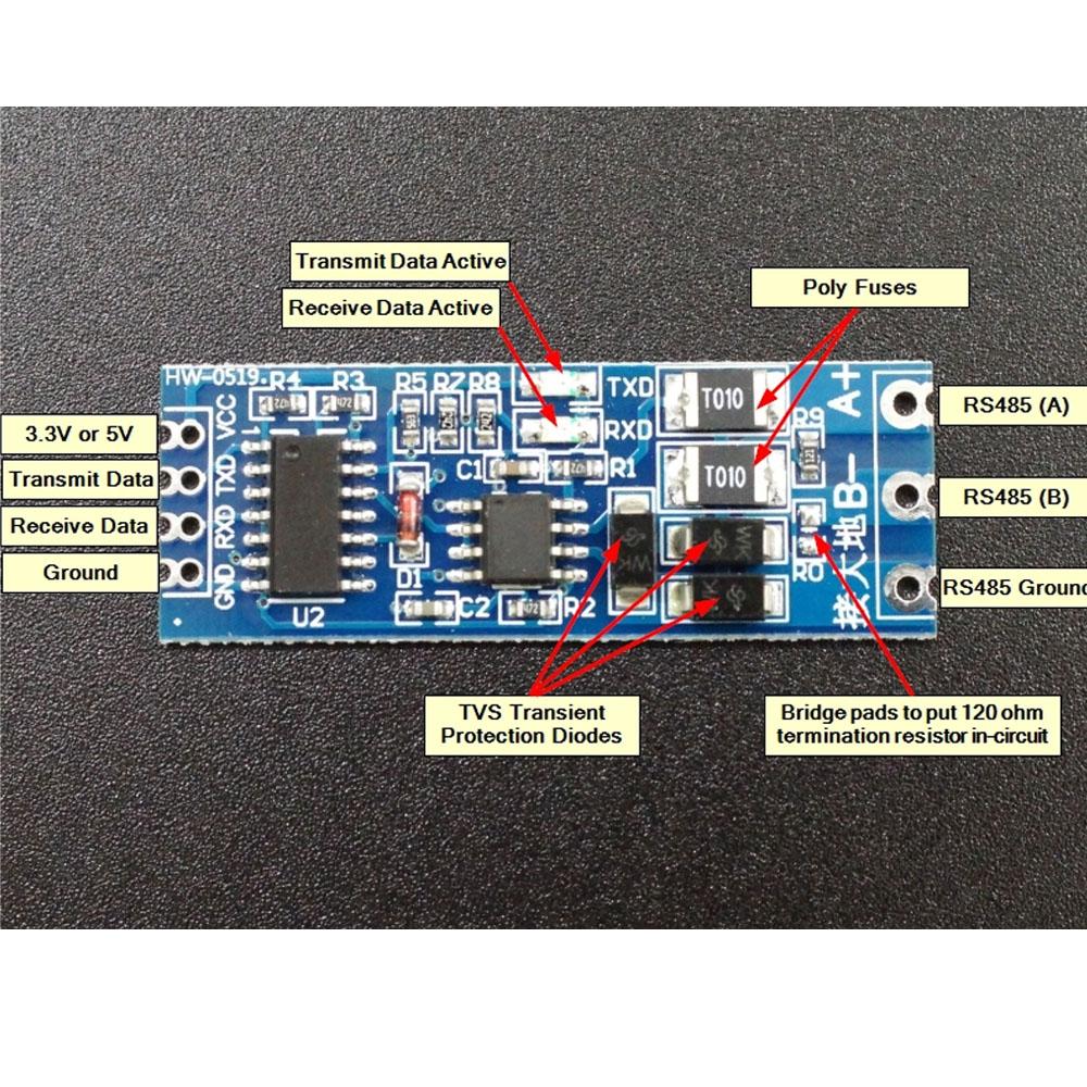 RS485 to TTL Converter Module Serial Port UART Hardware Automatic Flow Control Module is based of MAX485 chip, which is one of the most relied on when working with RS485 Bus. This module supports 3.3 V and 5V power supplies, and TTL Levels. It can connect and identify up to 128 nodes on the RS485 bus. This module also supports very long range of the bus.
