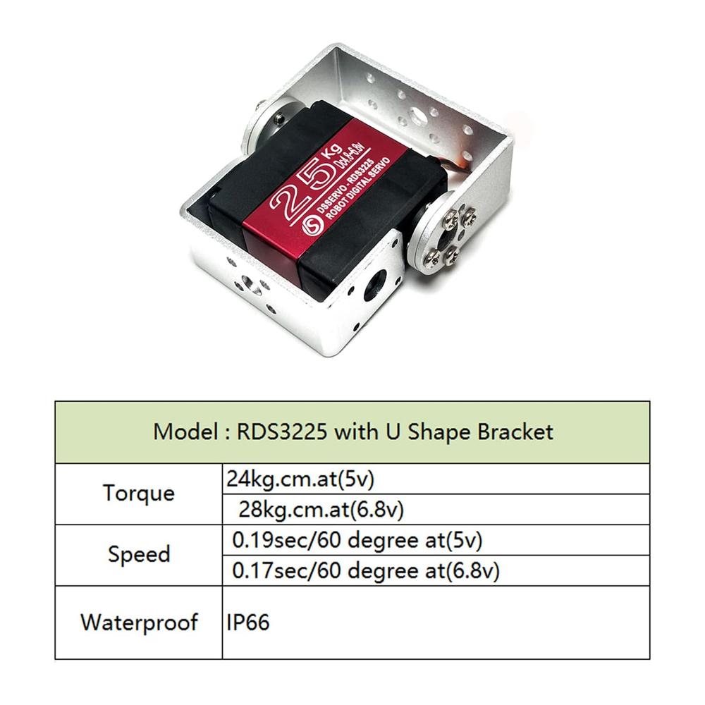The RDS3225 Digital Servo 25KG Dual Shaft 270 Degree With Metal Bracket Water Resistant and features high torque, metal gear, fast heat dissipation, sensitivity, and responsiveness. With high quality and performance, it is tailored for RC hobbyists to provide different experiences and delight.
