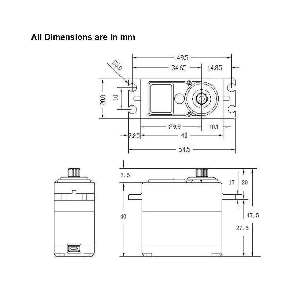 The DS3240 is a high quality servo motor and generates torque upto 40kgs. Suitable for high torque applications like Robot Arms, Grippers, Controlling Flaps in RC Planes, Steering Control in RC Cars, or as a generic mechanical actuator. The Improved DS3240 Model comes with a higher torque and speed compared to the generic DS3240. These servos come with metal gear and waterproof construction. They are IP66 rated for water and dust protection.