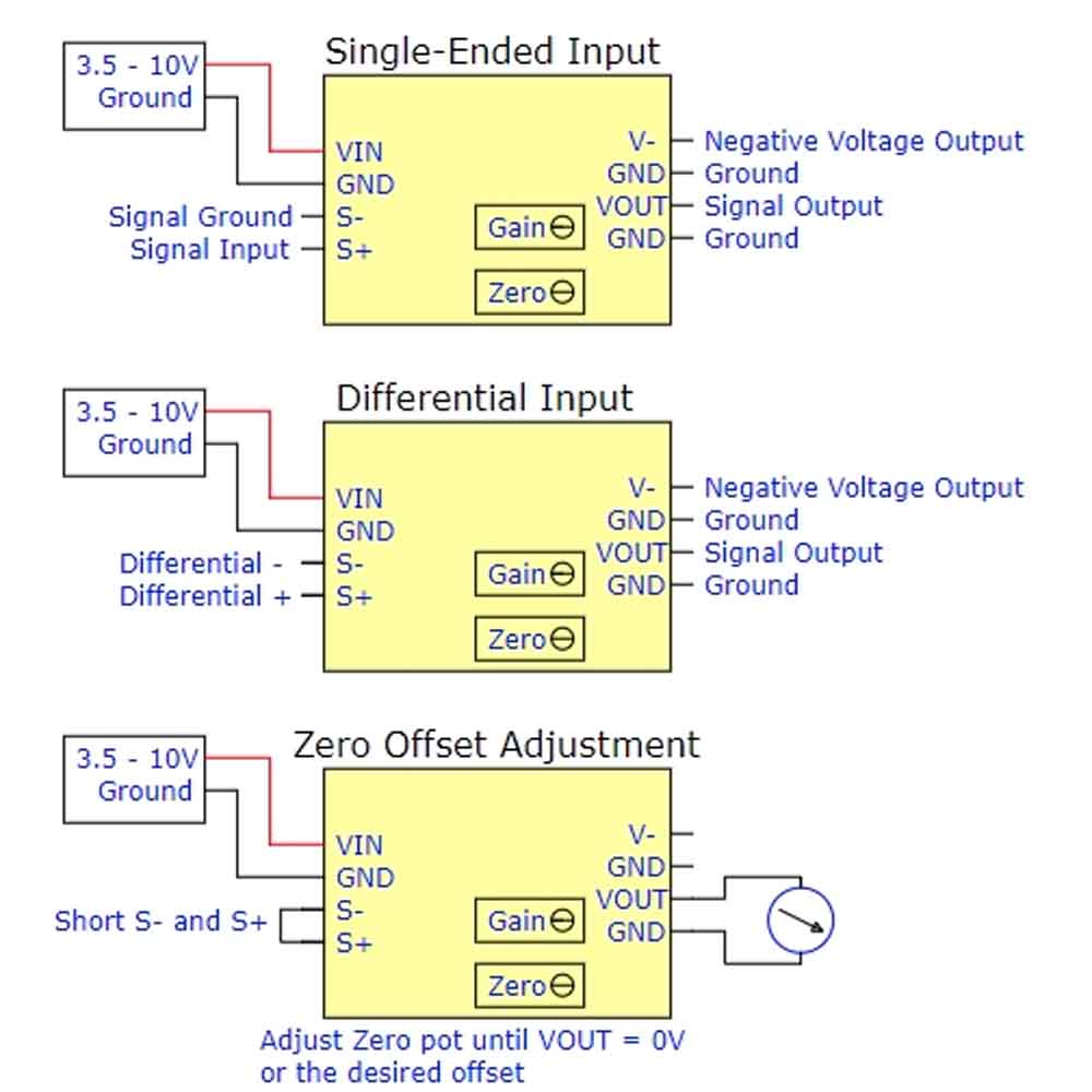 The diagrams below show the basic connection setups for single-ended and differential inputs as well as the setup for adjusting the Zero Offset.