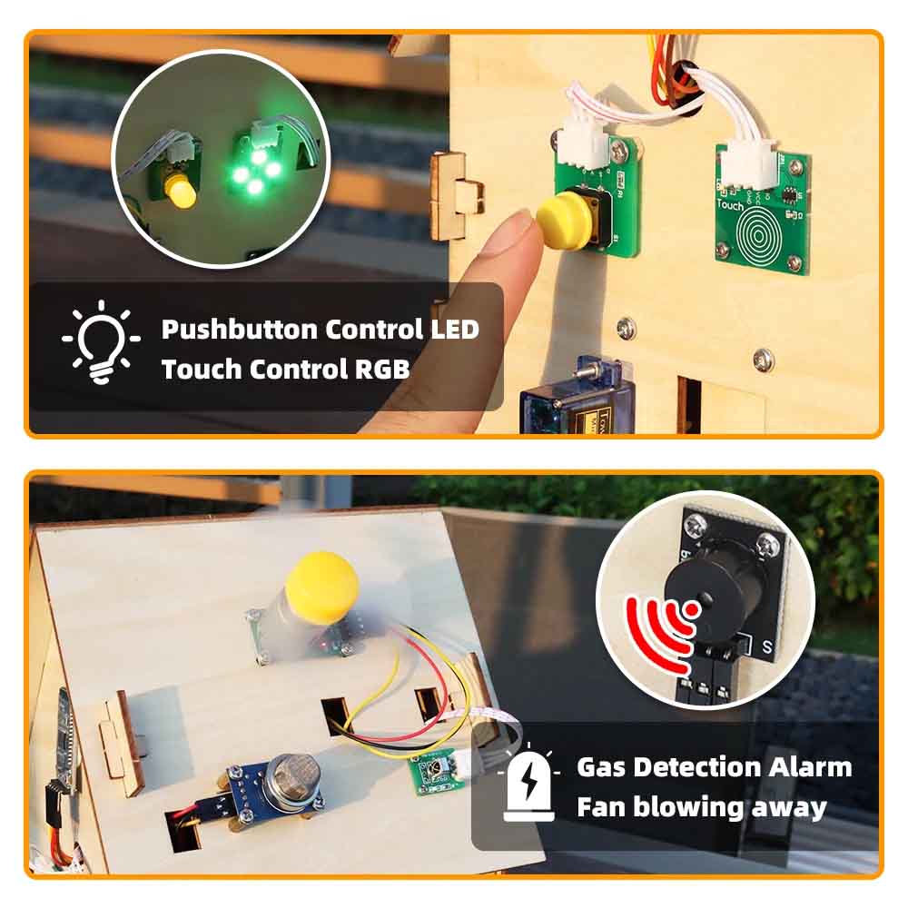 Enhance safety with a gas sensor and fan module coupled with a buzzer. Detect harmful gases in the kitchen or bathroom and trigger alerts via the buzzer while activating the smart fan to ventilate the area.