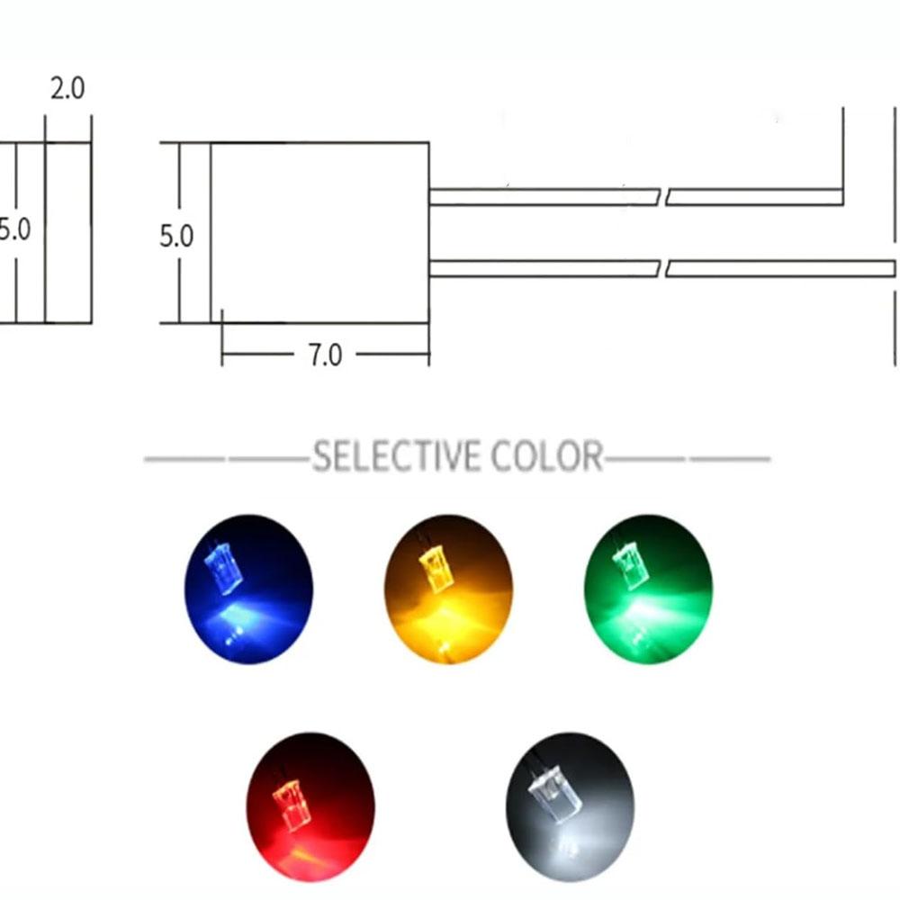 This square-shaped white LED measures 2mm x 5mm x 7mm and is designed for use in various electronic applications. It features a bright white light emission with a rectangular lens, making it ideal for indicating status, highlighting functions, or serving as a visual signal in electronic devices.