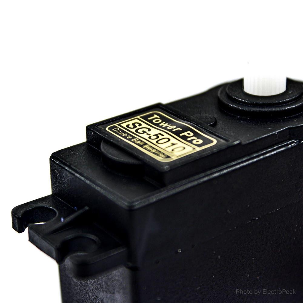 It equips Carbon Fiber Gears which makes the servo motor much lighter than the same metal gear motor. For small load applications using the metal gear servo motor adds on unnecessary weight, so we suggest using this lightweight plastic gear servo motor. It also equips high-quality bearings which ensure smooth and reliable operations. The TowerPro SG-5010 Servo rotates 90° in each direction, hence it is a 180° rotation servo. It is a Digital Servo Motor that receives and processes PWM signal faster and better. It equips sophisticated internal circuitry that provides good torque, holding power, and faster updates in response to external forces. They are packed within a tight sturdy plastic case which makes them water and dust-resistant which is a very useful feature in RC planes, Boats, RC Monster Trucks etc. It equips a 3-wire JR servo plug which is compatible with Futaba connectors too.