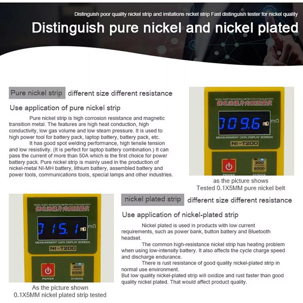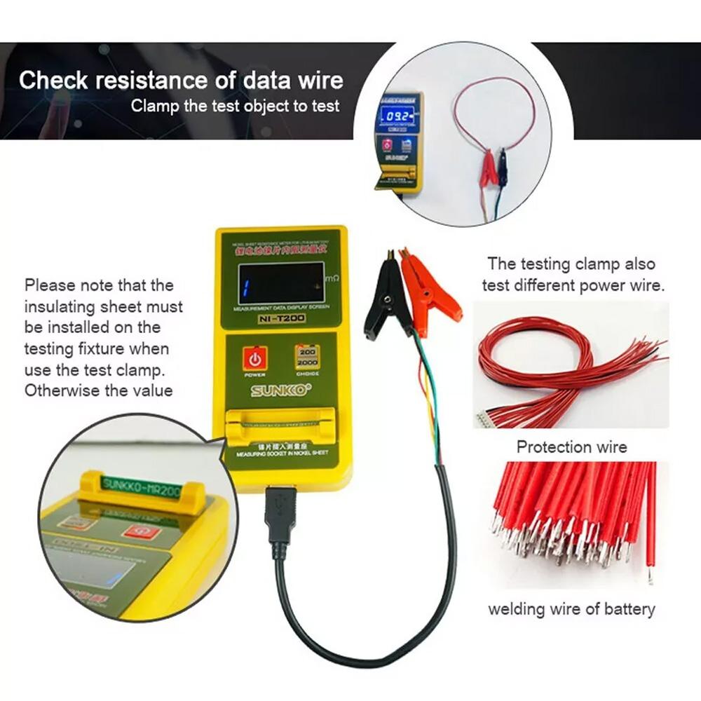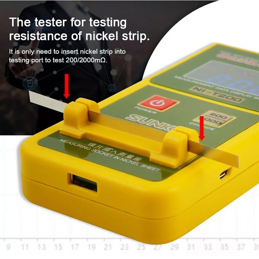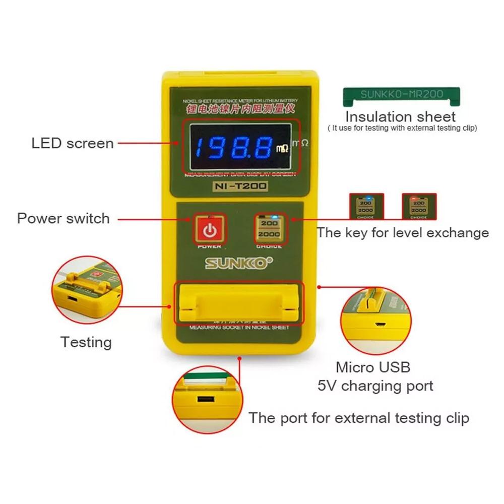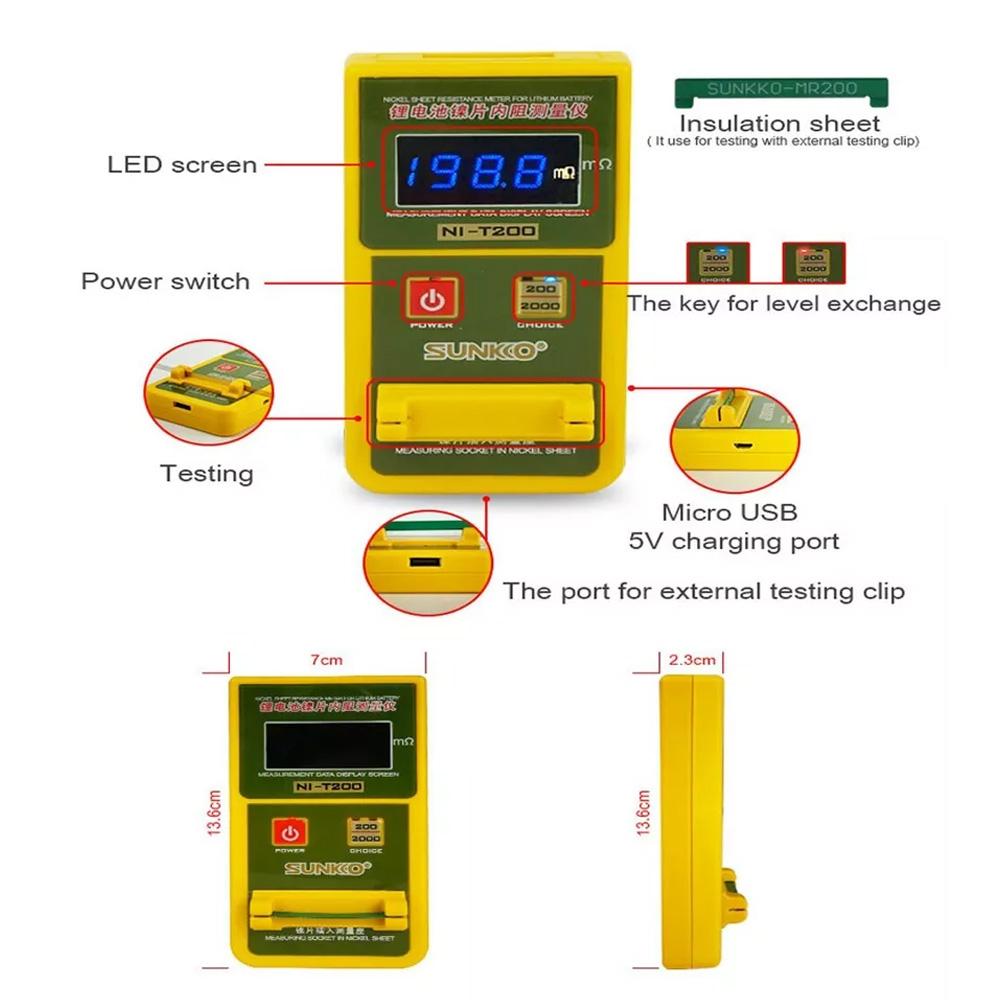 The Sunnko T200 Nickel Chip Internal Resistance Tester is a high-precision milliohmmeter designed to measure the internal resistance of various nickel-based materials. It offers accurate and reliable readings, making it an essential tool for quality control and research in industries involving battery manufacturing, electronics, and materials testing.