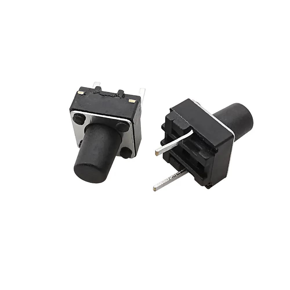 Tactile Push Button Switch is widely used as a standard input button on electronic projects. These work best when you mount it on PCB but can also be used on a solderless breadboard for temporary connections in prototypes. The pins are normally open (disconnected) and when the button is pressed they are momentarily closed and complete the circuit.