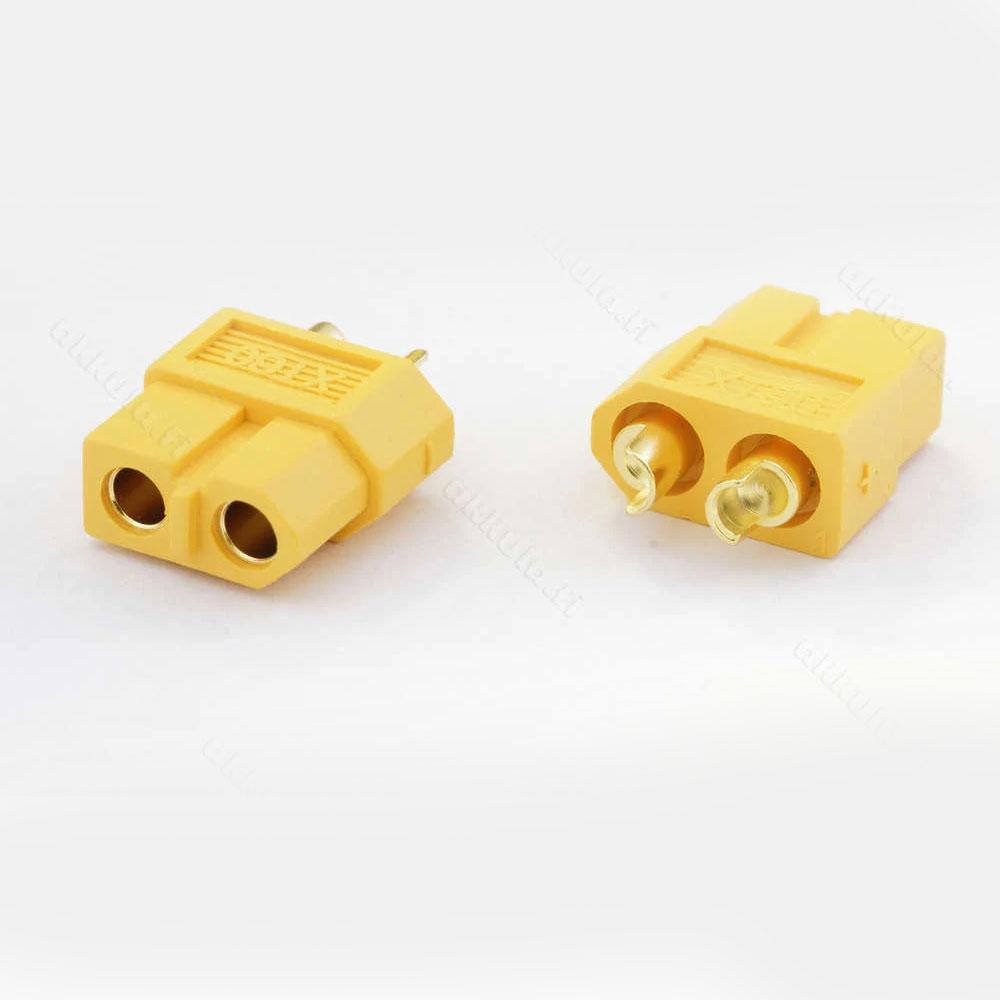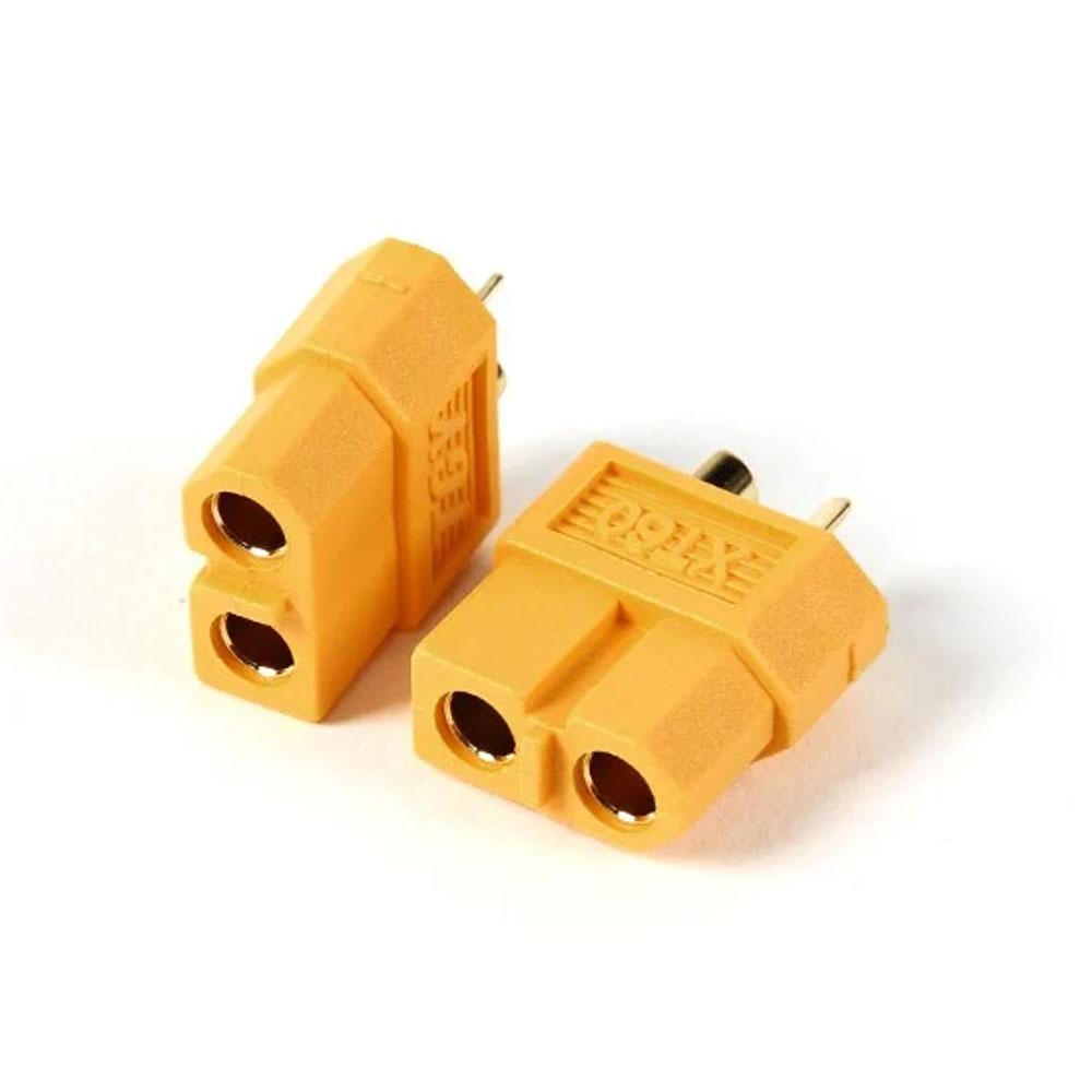 These connectors are made from high-temp nylon with gold-plated spring pins or sockets molded in. The shape of this generic XT60 prevents reverse polarity, and when plugged in the connection is super-solid. Perfect for applications up to 65A continuous draw.