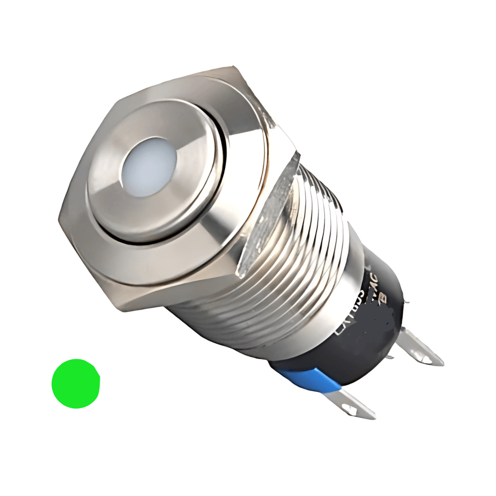 High Head 16mm 3-6V Non-Latching Green Dot Illuminated Silver Metal Switch